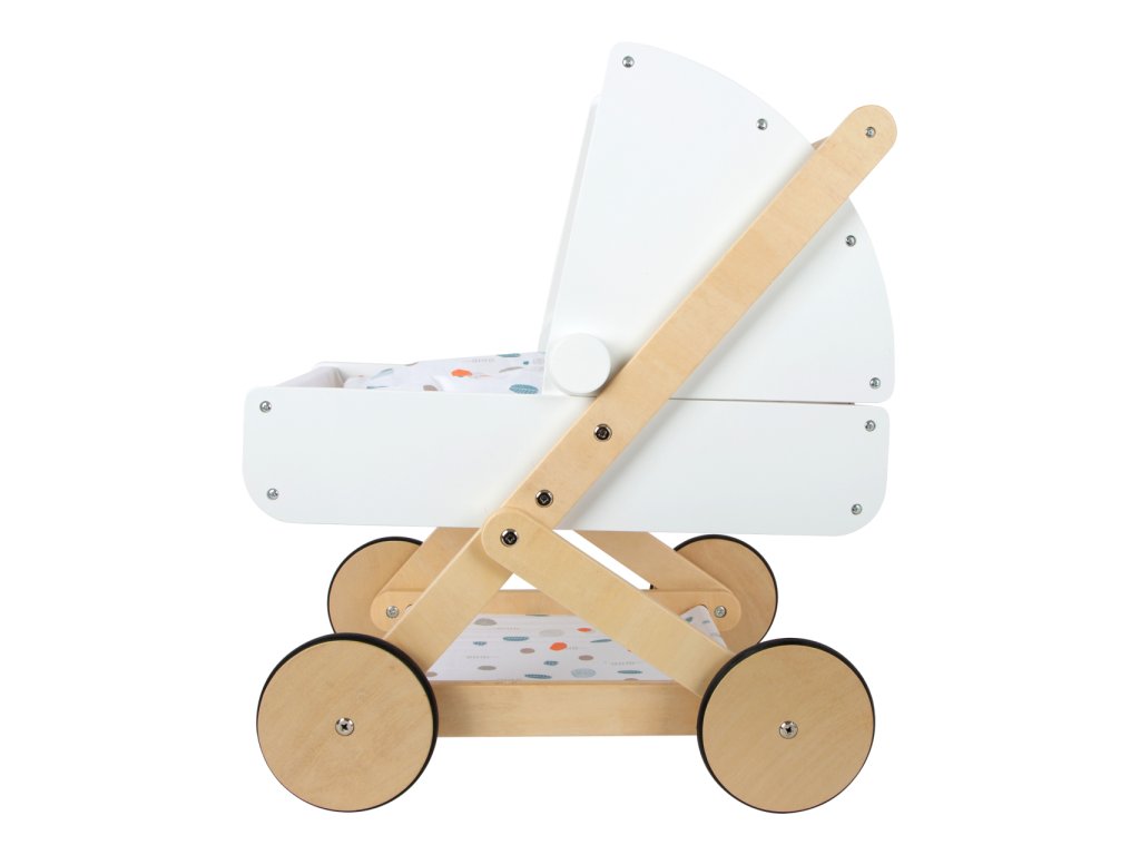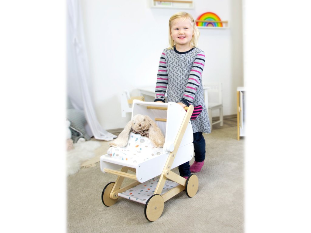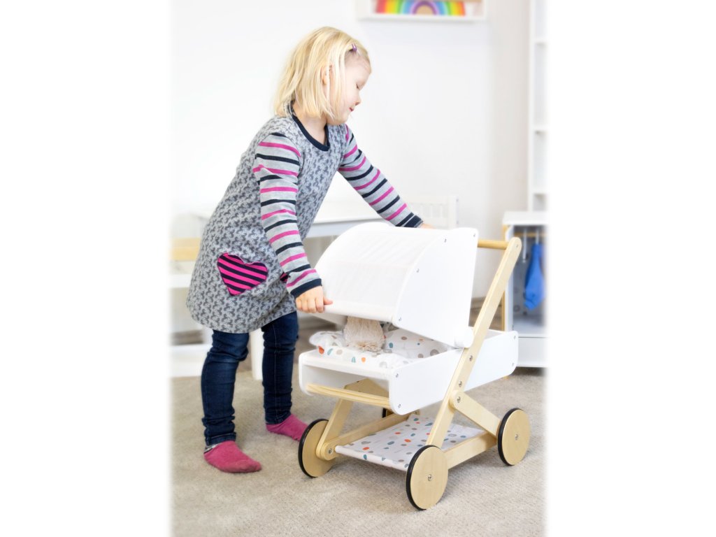 Pro panenky, plyšáky a jejich kamarády jen to nejlepší! Tento moderní kočárek pro panenky na vás udělá dojem svým jemným, lineárním skandinávským designem a také úložným prostorem pod lehátkem. Díky odklápěcí stříšce mohou panenky a plyšáci z kočárku koukat dopředu nebo dozadu. Oboustranné a genderově neutrální povlečení s peřinou nadměrné velikosti zajistí, že panenky a plyšáci do 46 cm budou v pohodlí. Kočárek má tichá pogumovaná kolečka. Moderní kočár s prvky z přírodního dřeva, s omyvatelným textilem jen čeká kdo se v něm sveze! Je velmi stabilní i při své nízké váze, hodí se do každého pokoje a to díky svému neutrálnímu designu. Hlavní vlastnosti: 2v1: Díky odklápěcí stříšce se mohou panenky a plyšáci dívat dopředu nebo dozaduPraktický úložný prostor pod lehátkemPogumovaná kolečka pro tichou a bezpečnou jízduStabilní konstrukce i při nízké vázeVhodné pro panenky a plyšáky do 46 cmZaoblené hrany a viditelně dřevěné prvkyOboustranné genderově neutrální povlečení, peřina nadměrné velikostiSkandinávský design, paleta jemných barev, prvky ze série „Little Button“ Little Button Řada atraktivního příslušenství pro panenky Little Button nabízí pestrou paletu výrobků, od kočárku přes jídelní židličku až po skříň. Zákazníky snadno zaujmou jednotným funkčním a decentním designem využívajícím přímé linie a střídmé neutrální barvy. Díky tomu spolu mohou vytvořit ucelené harmonické soupravy, které vkusně doplní moderní interiér. Důmyslná konstrukce a kvalitní zpracování pomáhají zajistit vysokou stabilitu, bezpečnost a dlouhou životnost. Založte s jejich pomocí stylový koutek pro panenky, kde mohou Vaše děti rozvíjet svou fantazii a pečovatelské dovednosti.
