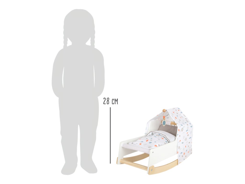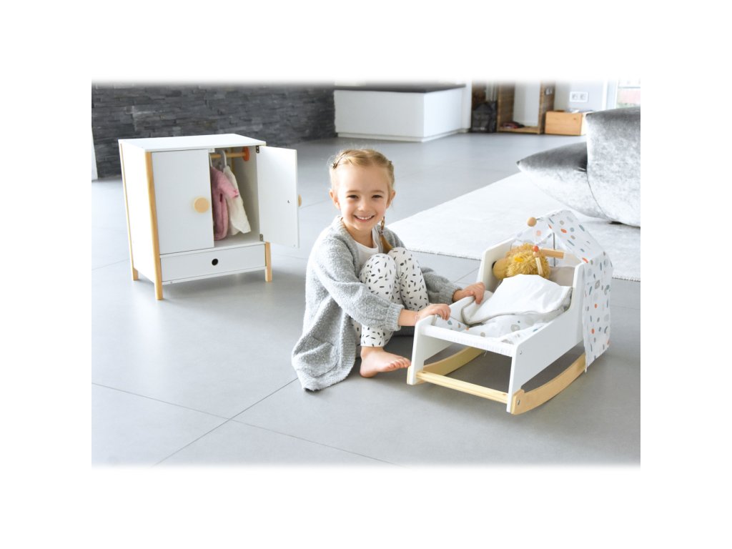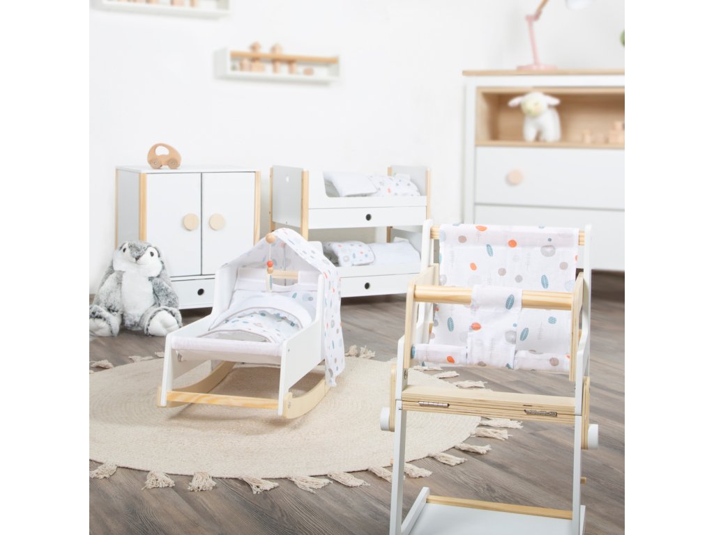 Panenky také potřebují spát! Tato moderní kolébka ve skandinávském designu je genderově neutrální, má oboustranné povlečení a pod velkou peřinou mohou spát panenky a plyšáci do 46 cm. Spodní část tzv. lyže kolébky jsou oddělitelné, stejně jako baldachýn. Vysoce kvalitní, stabilní konstrukce, zaoblené hrany, viditelně ze dřeva... Perfektní hračka do každého dětského pokoje. Hlavní vlastnosti: kolébka a postýlka v jednombaldachýn a závěsná hračkalyže a baldachýn lze oddělitstabilní konstrukce, kvalitní materiálygenderově neutrální povlečení, oversized peřinkazaoblené hrany, viditelně dřevěnápro panenky a plyšáky do 46 cmskandinávský lineární design, jemné barevné tóny Little ButtonŘada atraktivního příslušenství pro panenky Little Button nabízí pestrou paletu výrobků, od kočárku přes jídelní židličku až po skříň. Zákazníky snadno zaujmou jednotným funkčním a decentním designem využívajícím přímé linie a střídmé neutrální barvy. Díky tomu spolu mohou vytvořit ucelené harmonické soupravy, které vkusně doplní moderní interiér. Důmyslná konstrukce a kvalitní zpracování pomáhají zajistit vysokou stabilitu, bezpečnost a dlouhou životnost. Založte s jejich pomocí stylový koutek pro panenky, kde mohou Vaše děti rozvíjet svou fantazii a pečovatelské dovednosti.