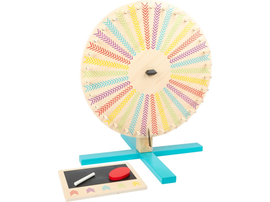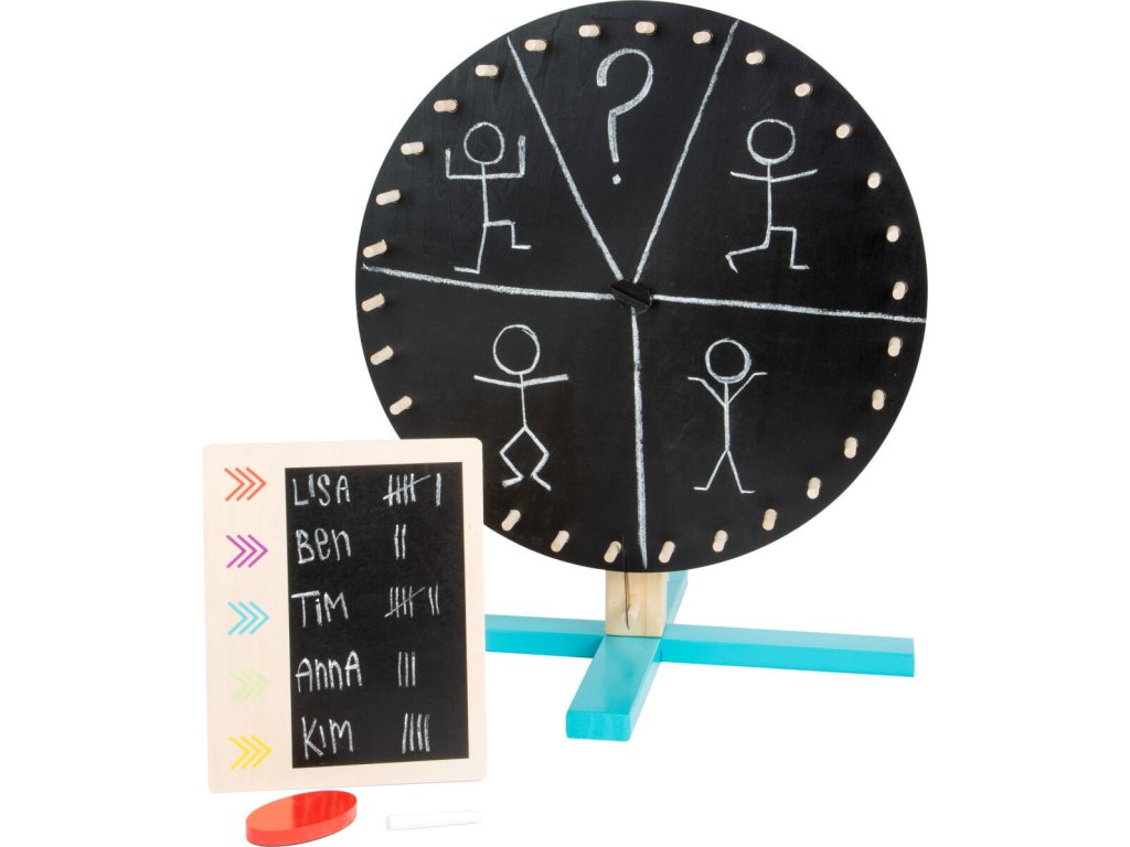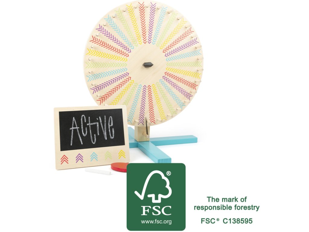 Vítěz s každým otočením! Kolo štěstí vyrobené z certifikovaného dřeva se skládá z kotouče, který se otáčí a lze jej snadno modifikovat. Na jedné straně je 30 barevných polí a na druhé straně je tabule. Můžete tak vytvářet vlastní soutěže znovu a znovu. Týmy a jména mohou být zapsána na menší samostatnou tabuli, která je součástí balení. Balení obsahuje také křídu a mazací houbu. Toto kolo štěstí je ideální pro zábavné hry doma, v mateřské škole nebo na narozeninových oslavách! Hlavní vlastnosti: rozvíjí komunikační dovednostivelká zábava pro kolektiv dětívyrobeno ze 100% FSC dřeva Značka a certifikát FSC® (Forest Stewardship Council) zaručuje, že dřevo, ze kterého byl produkt vyroben, nebylo vytěženo nelegálně a pochází z lesů obhospodařovaných šetrným či přírodě blízkým způsobem, ve kterém jsou dodržovány přísné environmentální a sociální požadavky. Značka FSC® na výrobku znamená, že svým nákupem pomáháte chránit lesy a podporujete šetrné, odpovědné či přírodě blízké hospodaření, díky kterému jsou naše lesy stabilnější, zdravější, mají přirozenou druhovou skladbu a lépe odolávají negativním následkům klimatických změn.