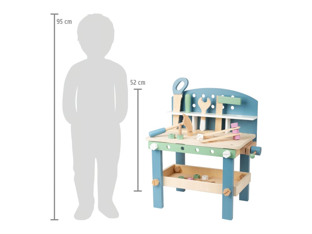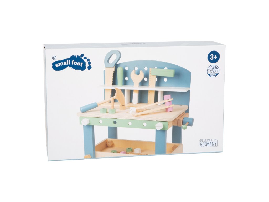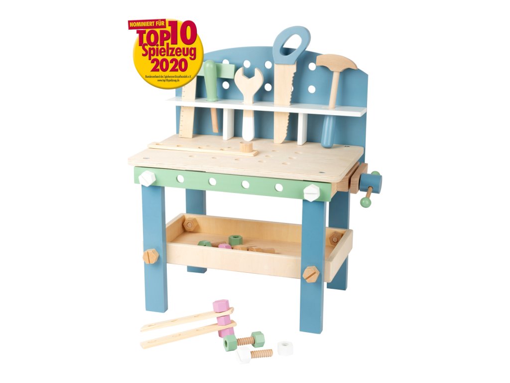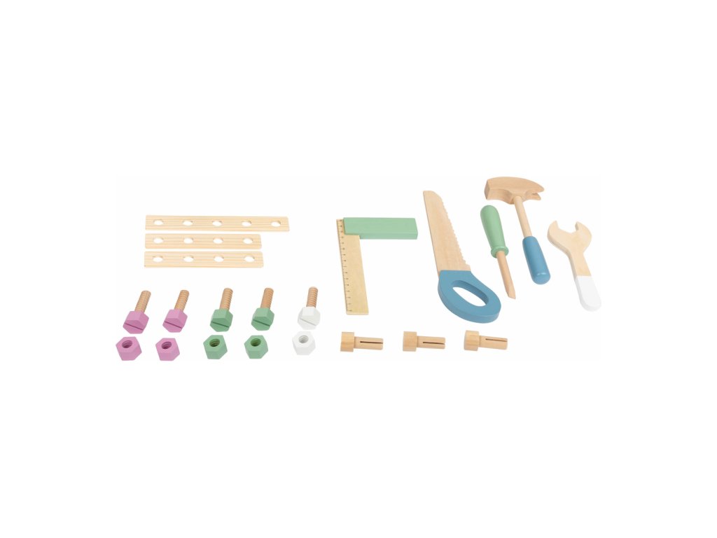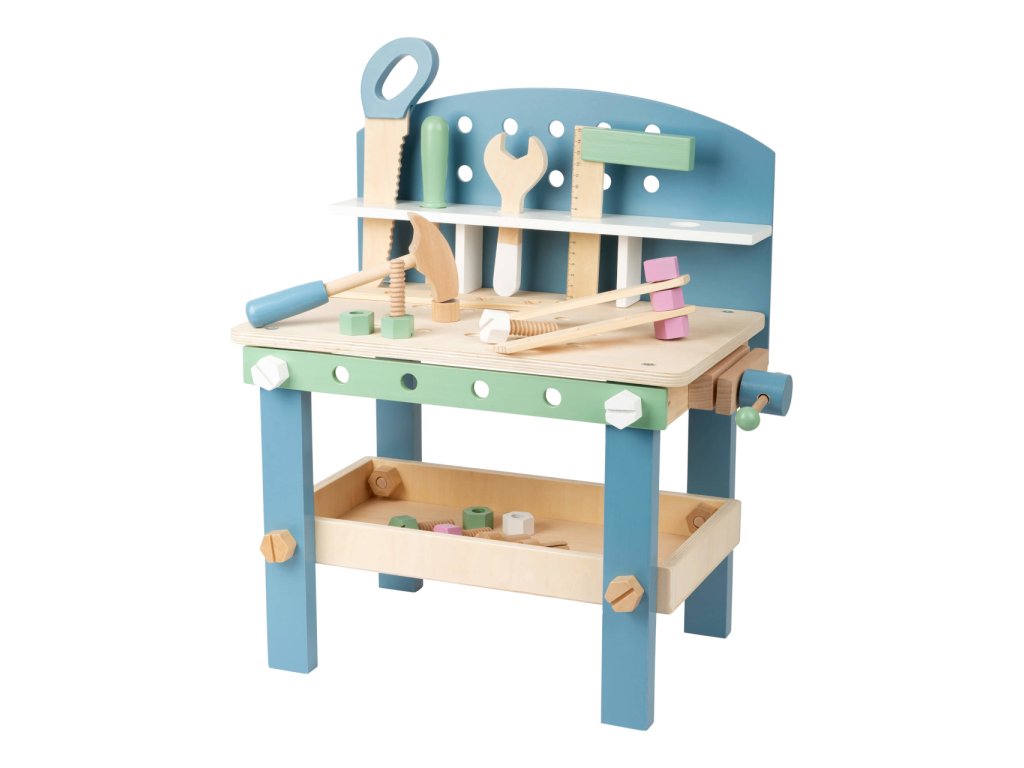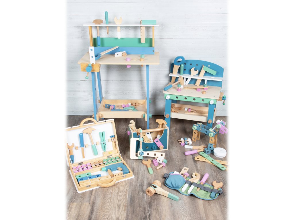 Video je pouze ilustrační, zobrazuje příbuzný produkt. Jemné pastelové barvy, pěkné tvary, přírodní materiál – to je severský design! S tímto dřevěným ponkem se mohou děti při hře naučit manuální zručnosti. Obsahuje 21 doplňků – 5 šroubů, 5 matek, 3 hřebíky, 5 kusů nářadí a 3 pláty s dírami pro trénování jemné motoriky. Děti mohou pomoci při složení ponku a dokázat tak, že mají talent pro manuální práci. Nářadí a doplňky mohou být uloženy do bezpečné poličky. Ponk se skandinávským designem se bude hodit do každého domova. Je to skvělá hračka pro kluky i holky. Hlavní vlastnosti Rozmanitá hra na kompaktním ponkuPěkné barvy s viditelným dřevem5 ks dřevěného nářadí a svěrákDěti mohou pomoci se složením ponkuJednoduché uložení nářadí a doplňků