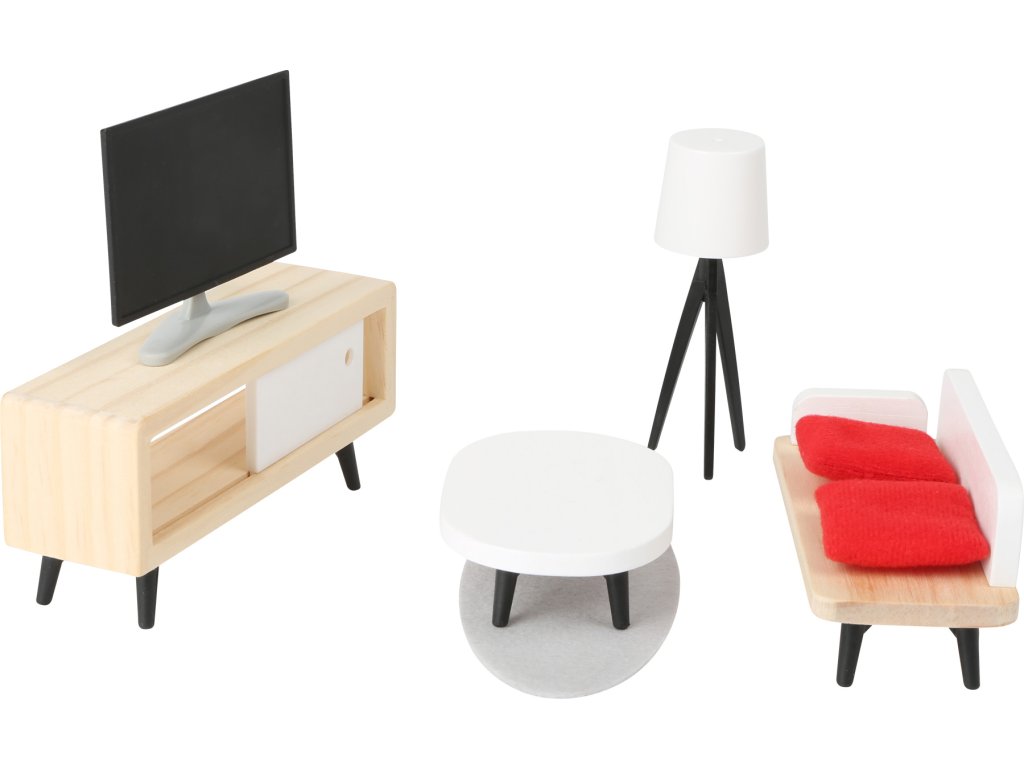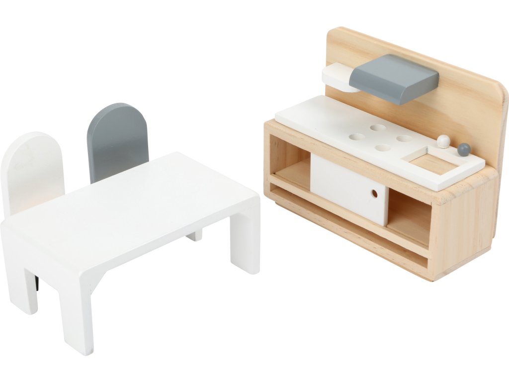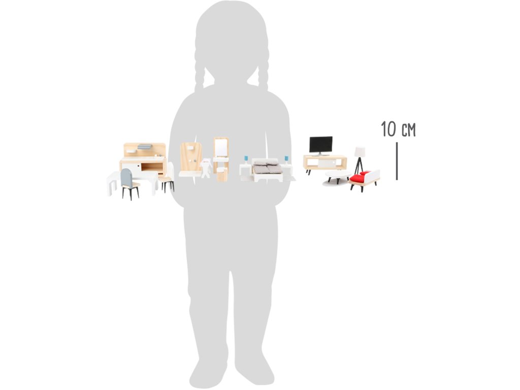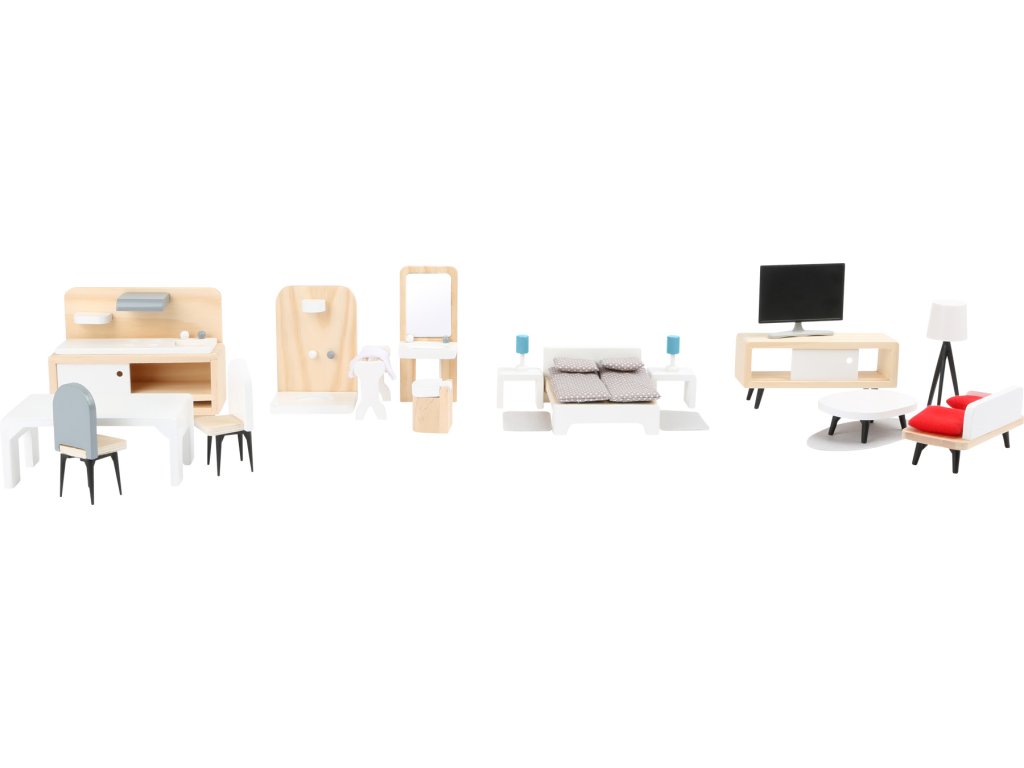 Moderní nábytek do domečku pro panenky ve skandinávském stylu. Komplet se skládá z obývacího pokoje, kuchyně, ložnice a koupelny. Nábytek je detailně zpracován. Například toaletu lze otevírat a zavírat, dvířka skříně a kuchyňské linky jsou posuvné. Součástí jsou i koberce, zrcadlo či ložní prádlo. Hlavní vlastnosti: obsahuje 28 dílůkvalitní detailní zpracování moderní provedenívhodné pro panenky do 12 cmpodporuje hraní rolí a představivost