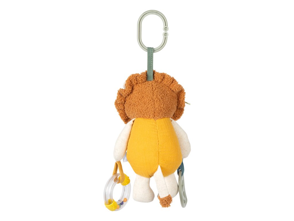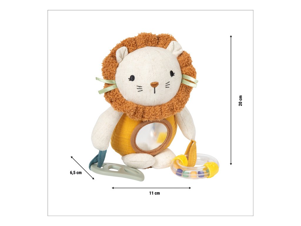 Mačkat, uchopovat, objevovat!Plyšová závěsná hračka Lvíček je všestranným společníkem pro miminka a batolata. Díky kombinaci kousátka, chrastítka a různých textur látek nabízí bohaté smyslové podněty a podporuje hravý rozvoj dítěte. Praktické závěsné poutko umožňuje snadné připevnění ke kočárku, autosedačce nebo na hrací hrazdičku. Měkká mušelínová látka, roztomilý lví obličej a příjemně mazlivý povrch dělají z této hračky oblíbeného společníka pro každý den.Tato multifunkční závěsná hračka v sobě spojuje senzorickou hračku, pomůcku při prořezávání zoubků i mazlivého kamaráda v jednom láskyplně navrženém produktu. Plyšový lvíček je vyroben z hebkého mušelínu, jehož jemně strukturovaný povrch stimuluje hmat a je příjemný i pro ty nejmenší děti. Různorodé materiály a integrované chrastítko vybízejí k dotýkání, poslouchání a objevování, zatímco kousátko poskytuje úlevu při prořezávání zoubků. Hlavní vlastnosti: multifunkční látková hračka pro miminka s motivem lvaintegrované chrastítko a kousátko pro senzorickou stimulaciideální velikost pro malé dětské ručičkyrozvíjí jemnou motorikupřipevnitelné ke kočárku, postýlce či autosedačcevyrobeno z měkké mušelínové tkaniny s texturovaným povrchempodporuje uchopení, dotýkání a první smyslové zážitkyperfektní hračka na cesty i domavhodné od narození