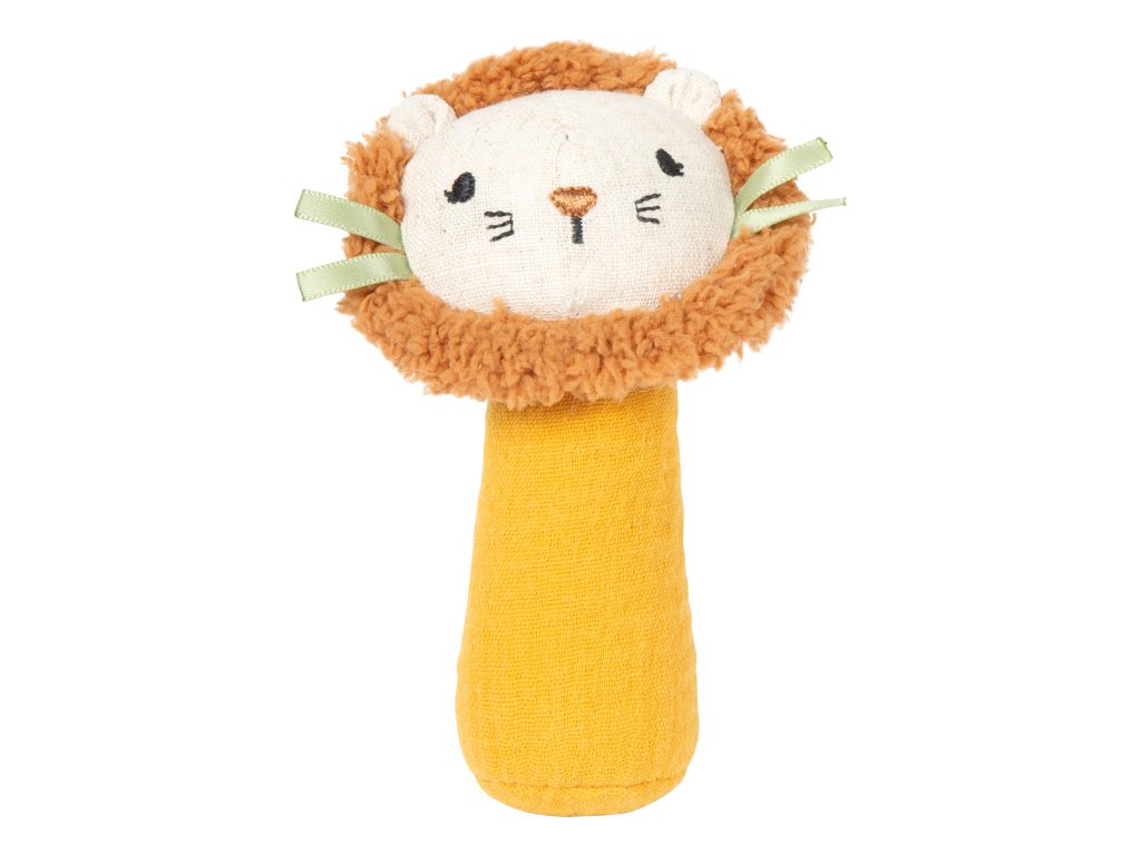 Chyť, poslouchej, objevuj!Toto kompaktní chrastítko přináší radost dětem už od prvních měsíců života. Měkká tkanina, přátelský lví obličej a jemné chrastivé zvuky vybízejí k hravému objevování. Praktický tvar je přizpůsoben malým dětským ručičkám a podporuje cílené uchopování i držení. Integrované chrastítko stimuluje sluchové vnímání, zatímco měkký materiál zajišťuje příjemný a bezpečný herní zážitek, a to i při ještě nekoordinovaných pohybech.Ať už jako první chrastítko nebo senzorická hračka k uchopení, toto měkké mini chrastítko spojuje funkčnost, hravý design a provedení vhodné pro děti. Veselý lví obličej upoutá pozornost miminka a chrastítko se rychle stane oblíbeným každodenním společníkem doma, na cestách i v kočárku. Hlavní vlastnosti: měkké mini látkové chrastítko s veselým designem lvaideální velikost pro malé dětské ručičkyintegrované chrastítko pro podporu sluchuvyrobeno z měkké mušelínové tkaniny s texturovaným povrchempodporuje uchopení, dotýkání a první smyslové zážitkyuklidňuje a poskytuje blízkost – ideální jako pomůcka pro spanívhodné od narození