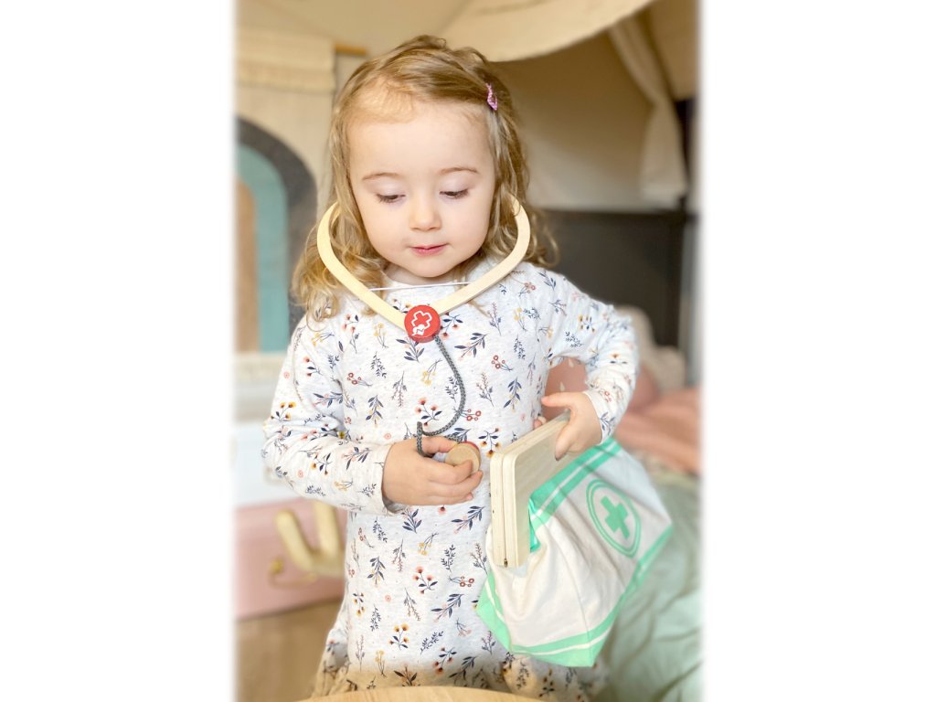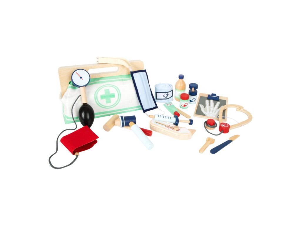 S touto standardní lékařskou brašnou budou mladí nadějní lékaři perfektně vybaveni. Brašna je vyrobená z měkkého textilu, je pěkná na pohled a také velmi funkční. Lze lehce otevřít díky magnetům, je vyrobena ze dřeva. Uvnitř brašny najdete všechno vybavení pro představivé ošetření pacientů: stetoskop, teploměr, stříkačku a mnoho dalšího – vše vyrobeno z pevného dřeva! Nejlepšími doplňky jsou zřejmě tlakoměr s manžetou a balónkem a otoskop s lupou. Tento obsáhlý set lékařských hraček obsahuje mnoho „opravdových“ lékařských nástrojů a přístrojů, s kterými si děti opravdu vyhrají. Ilustrace na lékařských pomůckách dětem poradí rozeznat nástroje a také jim možná zjednoduší jejich použití. Hlavní vlastnosti: Doktorská brašna s jasně viditelným dřevemTlakoměr s manžetou a balónkemTeploměr s nastavitelnou teplotouOtoskop s opravdovou lupouLahvička na léky se šroubovatelným víčkemNáplasti na suchý zipZnovu použitelné a pratelné dětské textilní rouškyDalší vybavení: injekční stříkačka s pohyblivým mechanismem, stetoskop, dezinfekce s pumpičkou, lahvička s léky a lžička, pinzeta, skalpel, reflexní kladivo