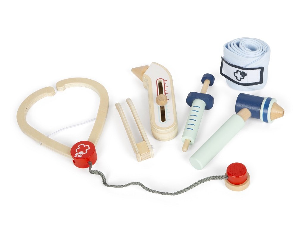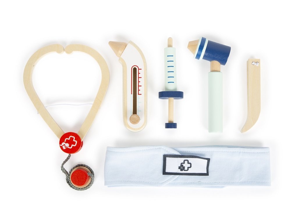 Ponořte se do vzrušujícího světa opravdové medicíny! Tato 6dílná sada má vše, co mladí lékaři potřebují. S lékařskou sadou jednoduše vyléčíte všechny nemocné plyšáky i panenky! Sada je vyrobena z robustního dřeva. Injekční stříkačka, teploměr, otoskop, pinzeta, obvaz a stetoskop nesmí chybět v žádné domácnosti malých lékařů. Tato herní sada aktivním způsobem inspiruje představivost a kreativitu mladých zdravotníků. Hlavní vlastnosti: 6dílná sadainjekce s pohyblivým pístem, otoskop se skutečnou lupou, teploměr s nastavitelným ukazatelem teploty, obvaz se suchými zipyrobustní a odolné provedení z masivního dřeva
