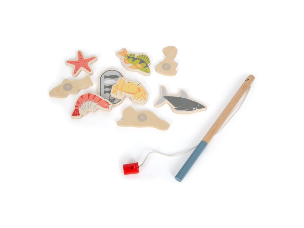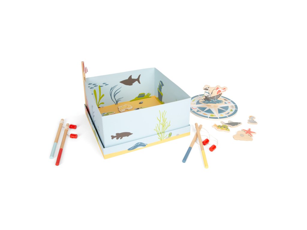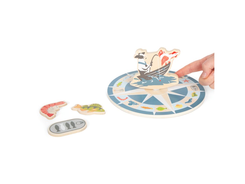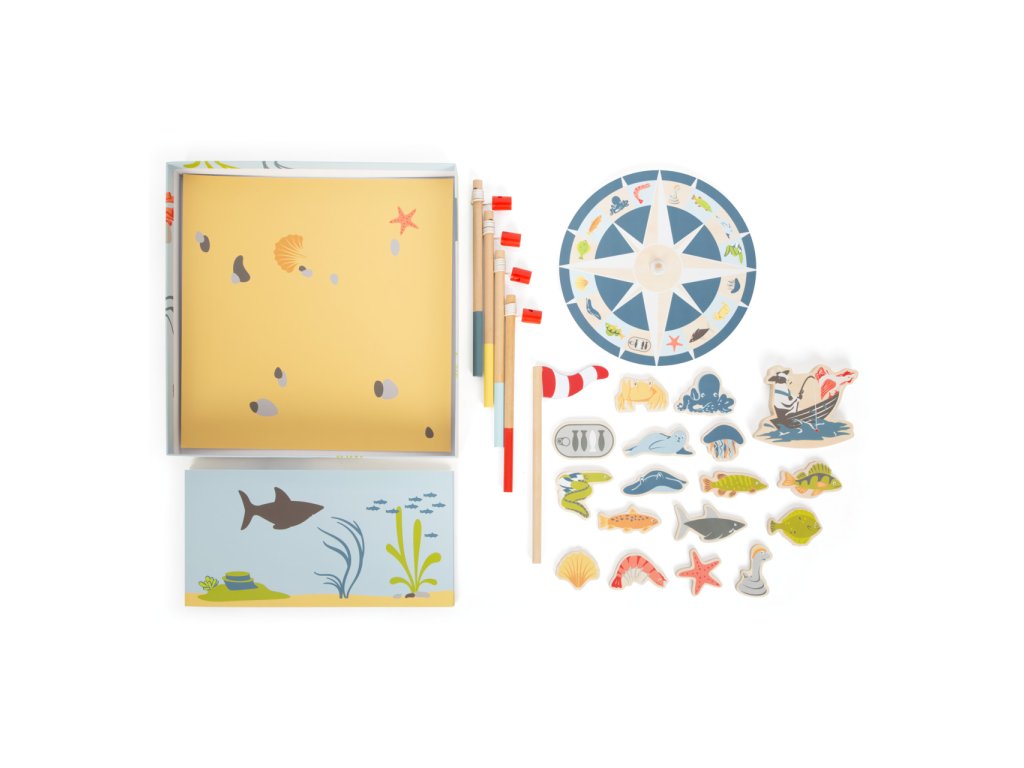 Vydejte se na moře rybařit s roztomilými zvířátky! Roztočte střelku kompasu, a vylosujte si tím mořského tvora, kterého máte ulovit. Chytáním magnetickou udičkou rozvíjejte jemnou motoriku a trpělivost, a to až se třemi přáteli, nebo v kruhu rodiny! Dílky hry jsou vyrobeny z odolné překližky a spolu s udičkami jsou uloženy v praktické, barevně ilustrované kartónové krabičce, která zároveň slouží jako hrací plocha. Hlavní vlastnosti:4 udičky, 16 herních dílků a 3 díly doplňkůpraktické balení