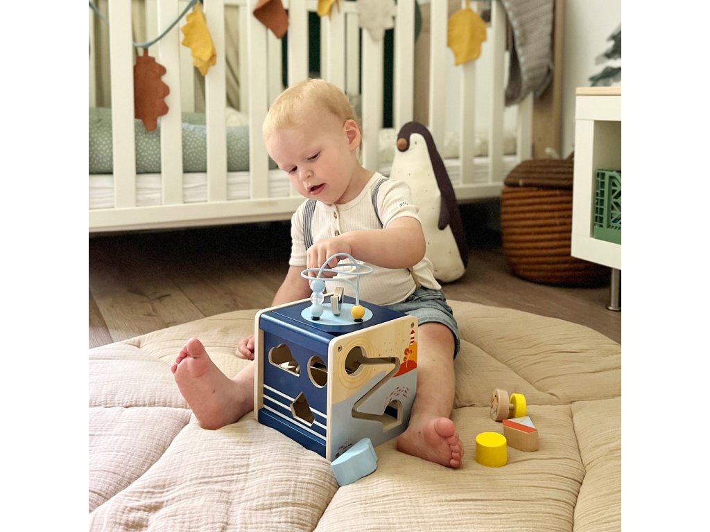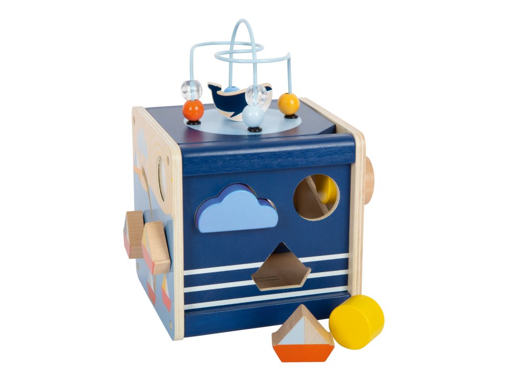 Dva korálkové labyrinty, vkládačka, posuvné bludiště a otočné čtverce na pěti stranách. Motorická kostka v tematice oceánu je vyrobena z pevného dřeva a co se týče zábavy, hry, učení a objevování, je opravdu všestranná. Má moderní barvy, mnoho přírodního dřeva, trénuje porozumění barvám a tvarům, pomáhá s rozvojem zručnosti a jemné motoriky, zlepšuje koordinaci ruka-oko a inspiruje k představivé hře. Syté kontrastní barvy a zrcadlo stimulují zrak dětí. Oddělitelné víko lze uložit do kostky, ušetříte tak místo.Chcete si procvičit motoriku? S touto kostkou to bude hračka! Veselí obyvatelé oceánu děti nadchnou k představivé hře. Moderní barevné schéma a mnoho přírodního dřeva, bude se hodit do každého dětského pokoje. Vodní živočichové děti doprovodí na cestě za dobrodružstvím a probudí jejich zvědavost. Kostka má zaoblené hrany. Hlavní vlastnosti: stabilní motorická kostka pět stran plných hrykorálkový labyrint, vkládačka, posuvné bludiště, otočné čtvercekvalitní ilustrace, moderní barevné schéma, mnoho přírodního dřevaoddělitelné víko lze uložit do kostky, ušetříte tak místomotivy oceánupříjemná haptika díky zaobleným hranámpomáhá s rozeznáváním barev a tvarů, trénuje zručnost a jemnou motoriku, zlepšuje koordinaci ruka-oko