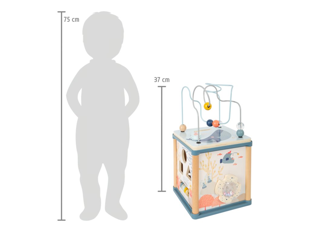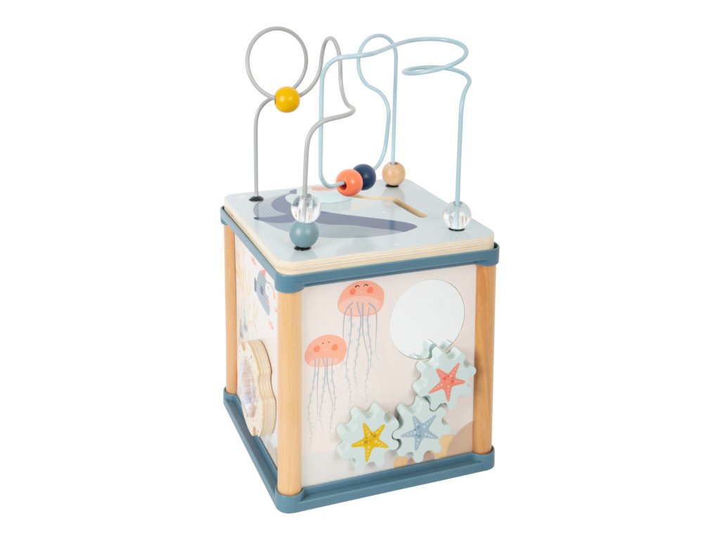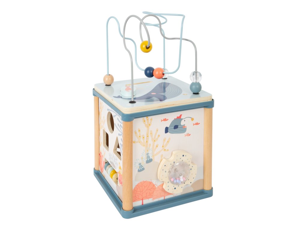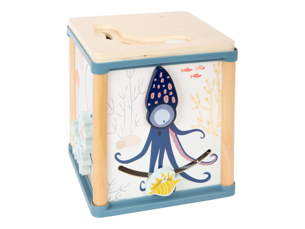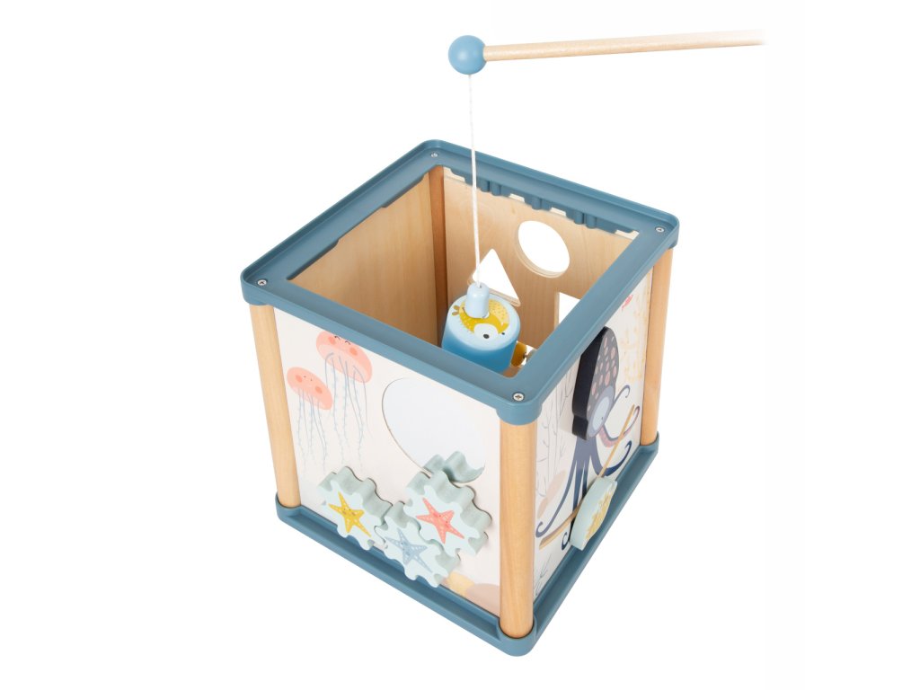 Pod hladinou se pořád něco děje. Motorická kostka přichází nejen s tradiční zábavou na pěti stranách, ale navíc i s magnetickým rybolovem. Lze si tak hrát s korálkovým, nebo posuvným labyrintem, počítadlem, otočným chrastítkem, ozubenými kolečky se zrcátkem, nebo vkládačkou, jejíž dílky lze zevnitř kostky chytat magnetickou udičkou. Jejím prostřednictvím lze procvičovat jemnou motoriku a rozvíjet trpělivost i soustředění. Hračka je bohatě dekorovaná a děti budou při hrách provázet roztodivná stvoření ze světa pod hladinou, chobotnice přitom díky pružině dokonce zábavně pohupuje svým tělem. Všechny díly a korálkový labyrint lze otočením víka prakticky uklidit dovnitř kostky, nebude tak překážet a přitom vyzdobí poličku. Zpracování je robustní a odolné, využívá kombinace silné překližky a masivního dřeva. Hlavní vlastnosti:motorická kostka s víkem, 3 díly vkládačky a magnetická udičkamotorické, zrakové i sluchové atrakcerobustní a odolné provedení