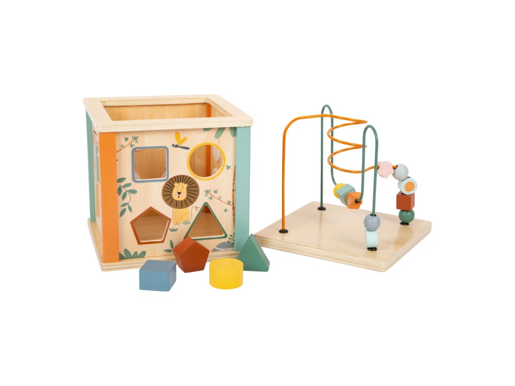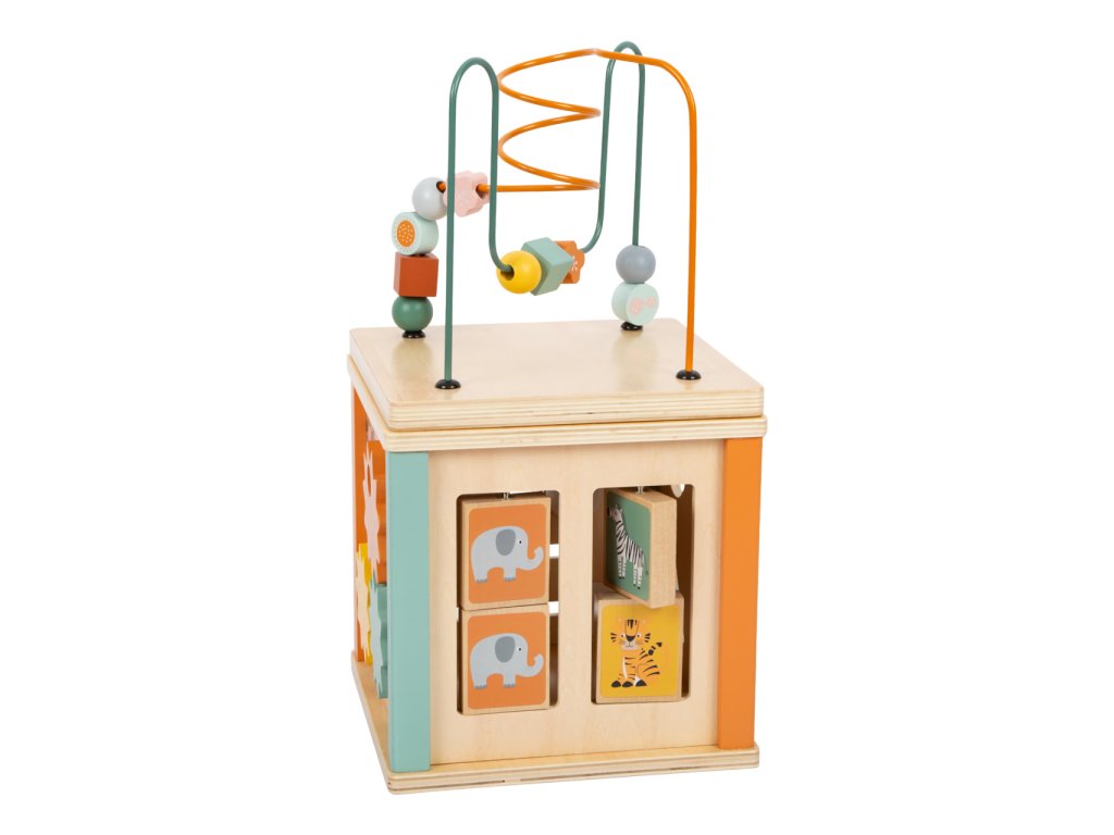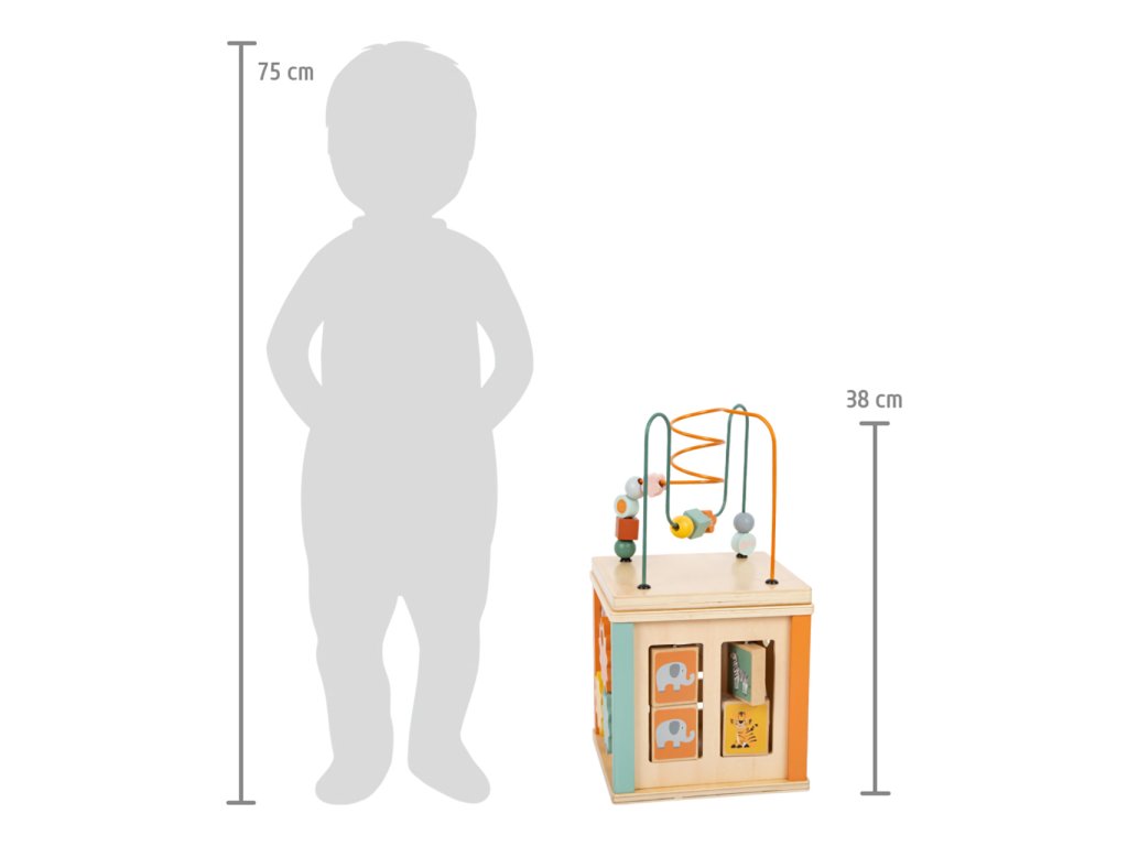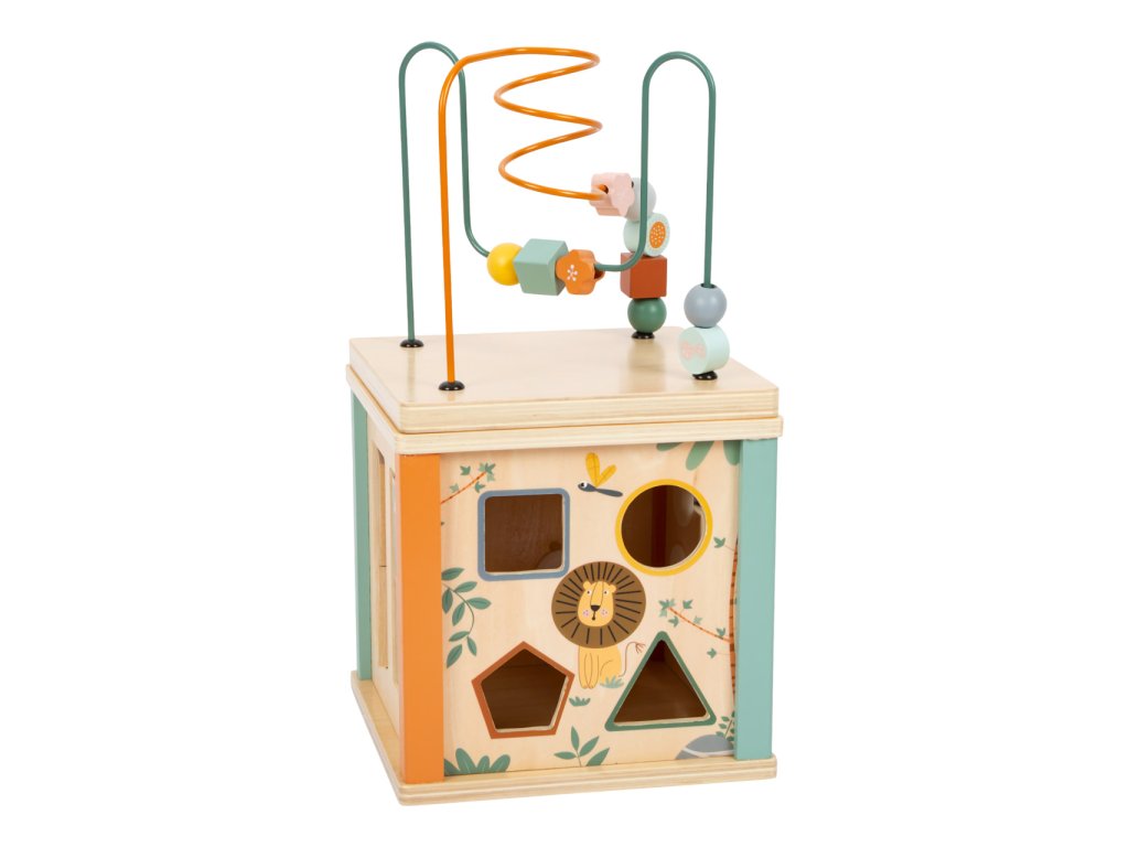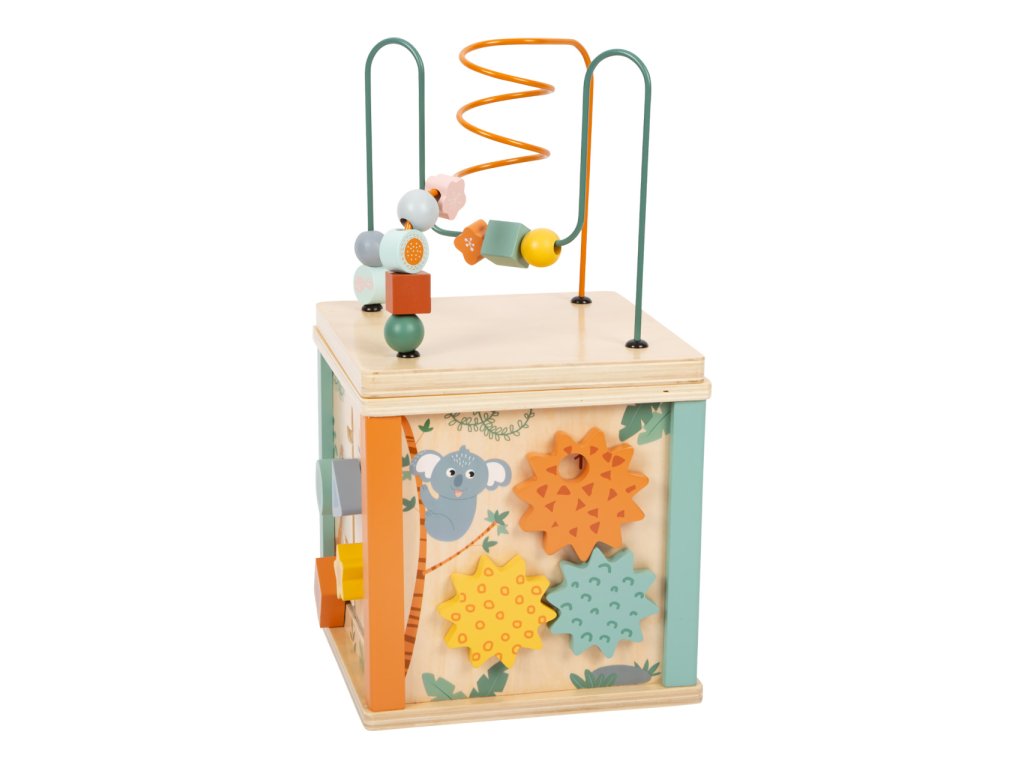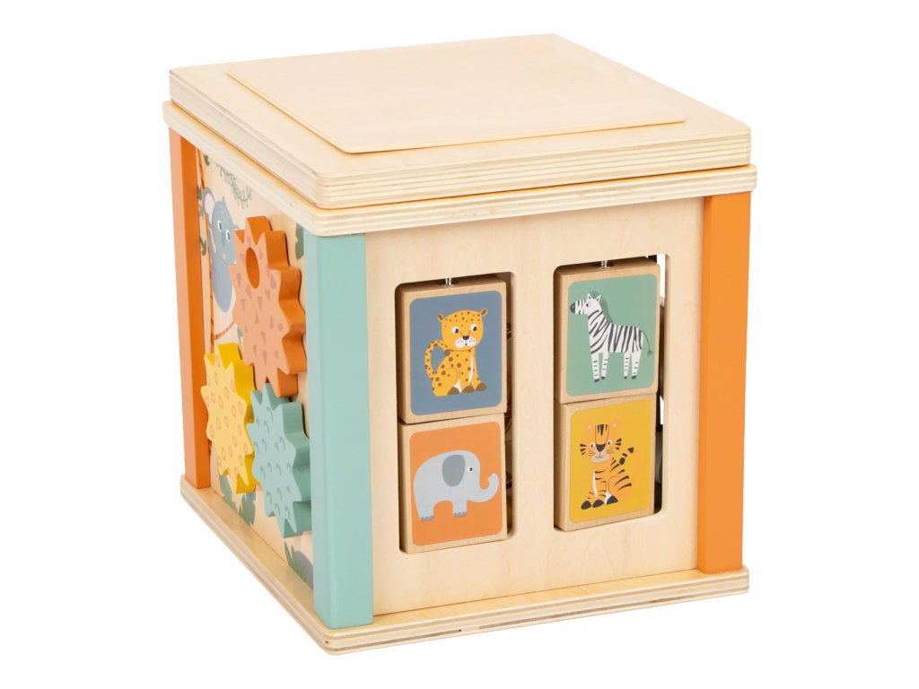 Prozkoumejte džungli motorických aktivit. Kostka je vyvedena v originálních a atraktivních safari barvách a motivech, s mnoha roztomilými zvířátky. Po stranách nabízí posuvné i korálkové bludiště, otočné kameny, ozubená kolečka a vkládačku. Děti s jejich pomocí mohou rozvíjet orientaci v prostoru, jemnou motoriku i koordinaci rukou a zraku. Korálkové bludiště lze do kostky prakticky uložit otočením víka. Hračka je robustní a odolná, vyrobena ze silné překližky. Hlavní vlastnosti: kostka s víkem a 4 díly vkládačky5 druhů aktivitodolné dřevěné provedení