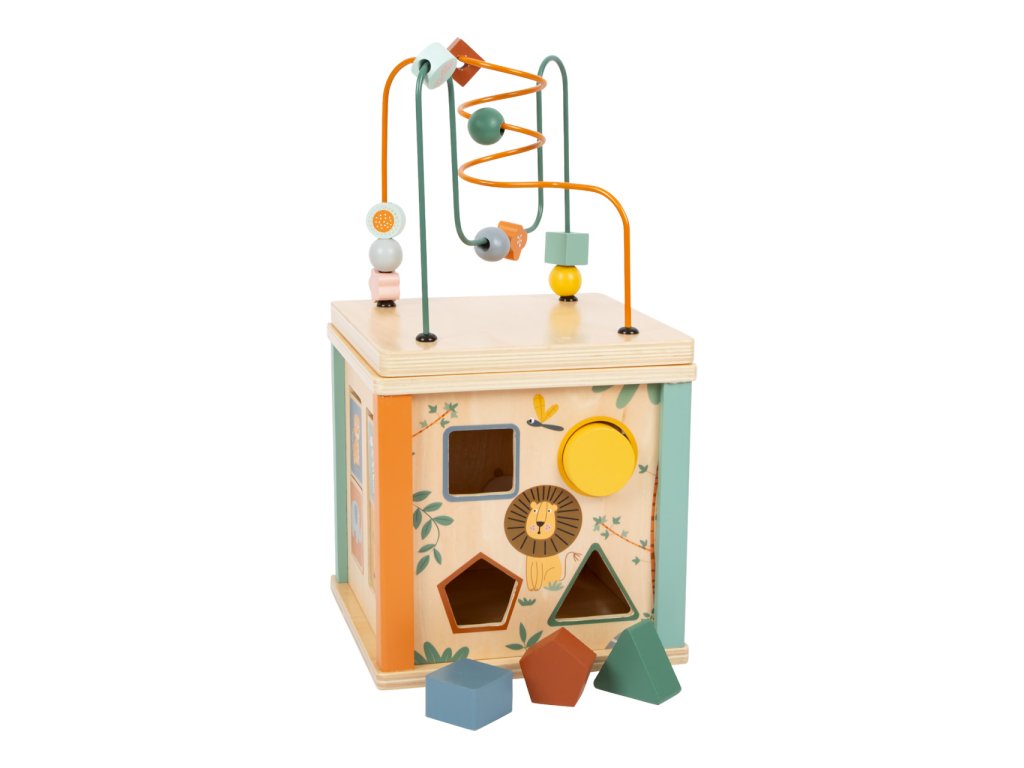 Prozkoumejte džungli motorických aktivit. Kostka je vyvedena v originálních a atraktivních safari barvách a motivech, s mnoha roztomilými zvířátky. Po stranách nabízí posuvné i korálkové bludiště, otočné kameny, ozubená kolečka a vkládačku. Děti s jejich pomocí mohou rozvíjet orientaci v prostoru, jemnou motoriku i koordinaci rukou a zraku. Korálkové bludiště lze do kostky prakticky uložit otočením víka. Hračka je robustní a odolná, vyrobena ze silné překližky. Hlavní vlastnosti: kostka s víkem a 4 díly vkládačky5 druhů aktivitodolné dřevěné provedení