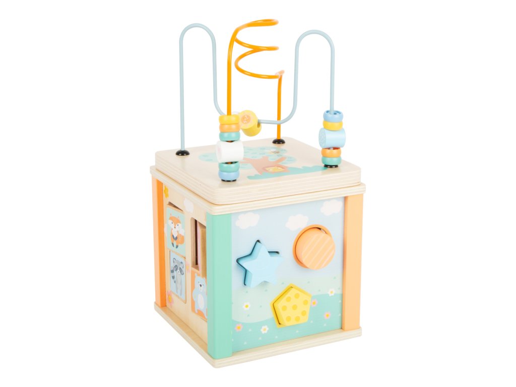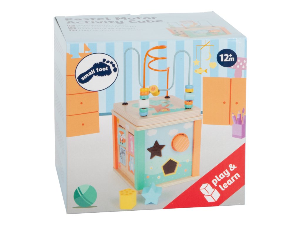Skládejte, strkejte, klapejte, otáčejte! Můžete si hrát ze všech pěti stran! Dřevěná motoriká kostka nabídne zábavu i nejmenším dětem. Perličkové bludiště, otáčející se obrázky, otvory s kostkami pro vkládání, ozubená kolečka – všechny tyto prvky děti naučí rozevnávat barvy a tvary a také procvičí jejich jemnou motoriku. Trendy pastelové barvy, roztomilé zvířecí motivy, hravé detaily, tato kostka bude pravým poutačem v každém dětském pokojíku. Vrchní víko můžete sundat a uložit do kostky vzhůru nohama, ušetří vám tak kousek místa. Krásná motorická kostka je součástí produktové řady „Pastel“ a zaujme vysokým viditelným podílem dřeva a moderním zabarvením v pastelových barvách. Hlavní vlastnosti: ilustrováno, jemné pastelové barvykompaktní, skladné provedení