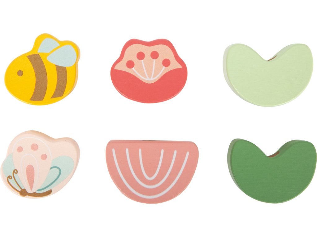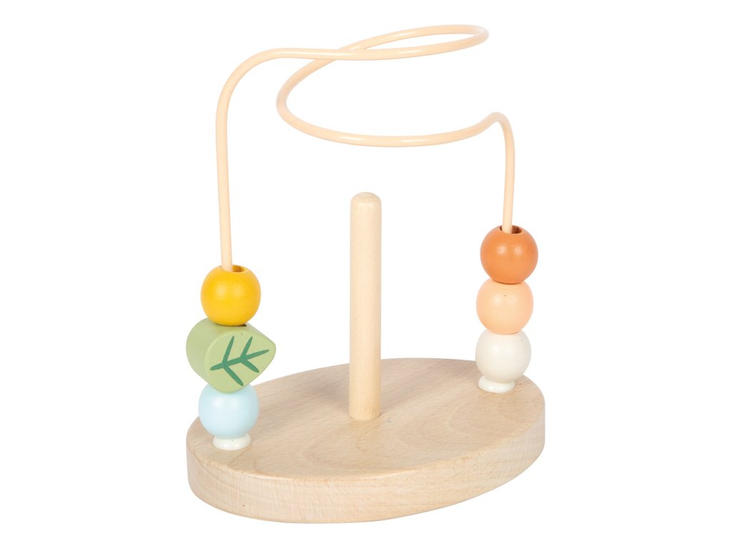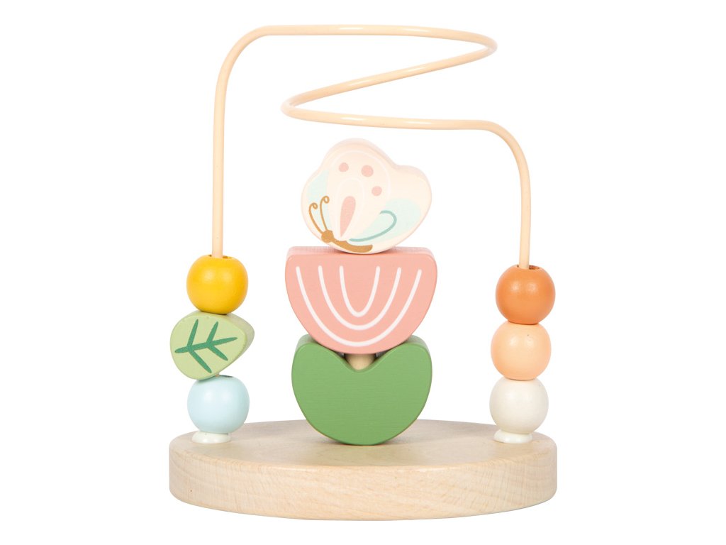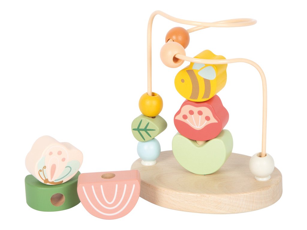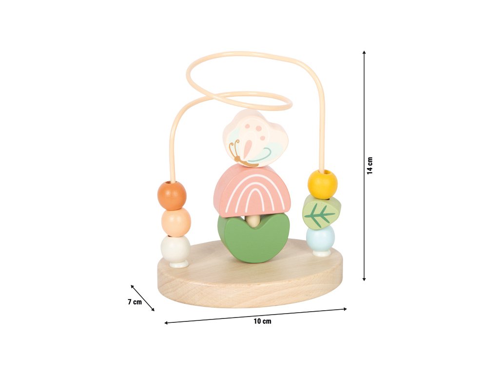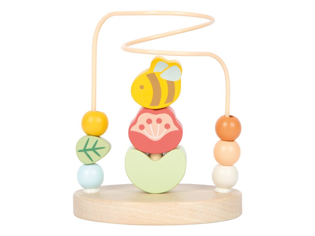 Tento kompaktní labyrint s korálky nabízí zábavnou a bezpečnou hru pro malé objevitele. Pevná kovová smyčka je osazena šesti barevnými dřevěnými prvky, které lze volně posouvat po dráze, což podporuje rozvoj úchopu, jemné motoriky a koordinace ruky a oka. V samém středu smyčky je navíc malá skládací hra, kde lze jednotlivé dřevěné prvky (včelku, motýlka, dva okvětní lístky a dva listy) skládat na sebe, čímž se rozvíjí koncentrace a obratnost dítěte.Labyrint je vyroben z kvalitního dřeva a kovu s bezpečně zaoblenými hranami a obsahuje vysoký podíl přírodního materiálu. Díky svému kompaktnímu a lehkému provedení je ideální pro hraní doma i na cestách. Tato hra spojuje hravý design s edukativními přínosy – děti se učí hravou formou zatlačovat, uchopovat, posouvat a stavět, čímž rozvíjejí své první motorické dovednosti a jemnou motoriku. Hlavní vlastnosti: kompaktní a lehká konstrukce vhodná doma i na cestáchpevná kovová smyčka s šesti barevnými dřevěnými prvky k posouváníintegrovaná skládací hra se šesti dřevěnými prvky (včelka, motýlek, 2 okvětní lístky, 2 listy)vyrobeno z kvalitního dřeva a kovu, bezpečné zaoblené hranypodporuje jemnou motoriku