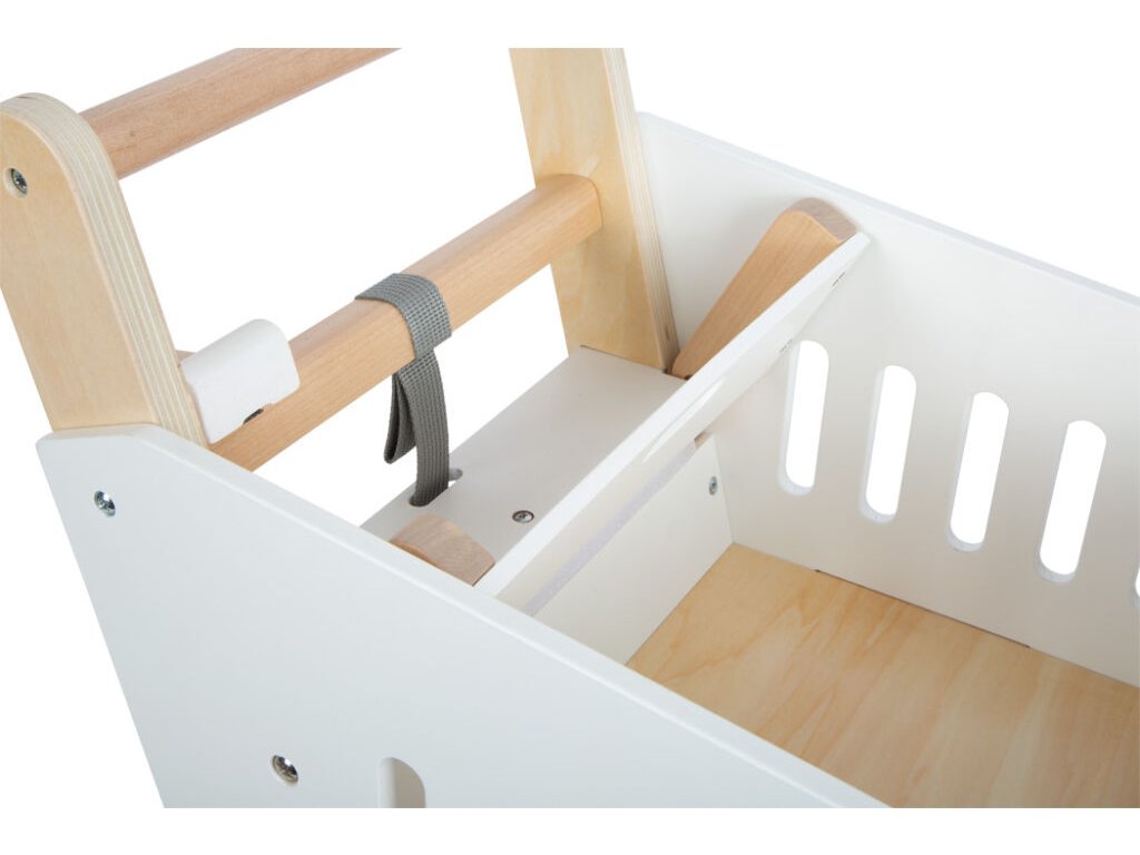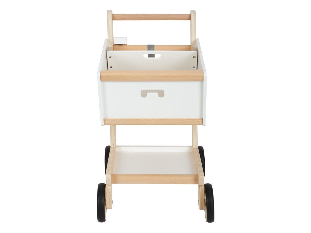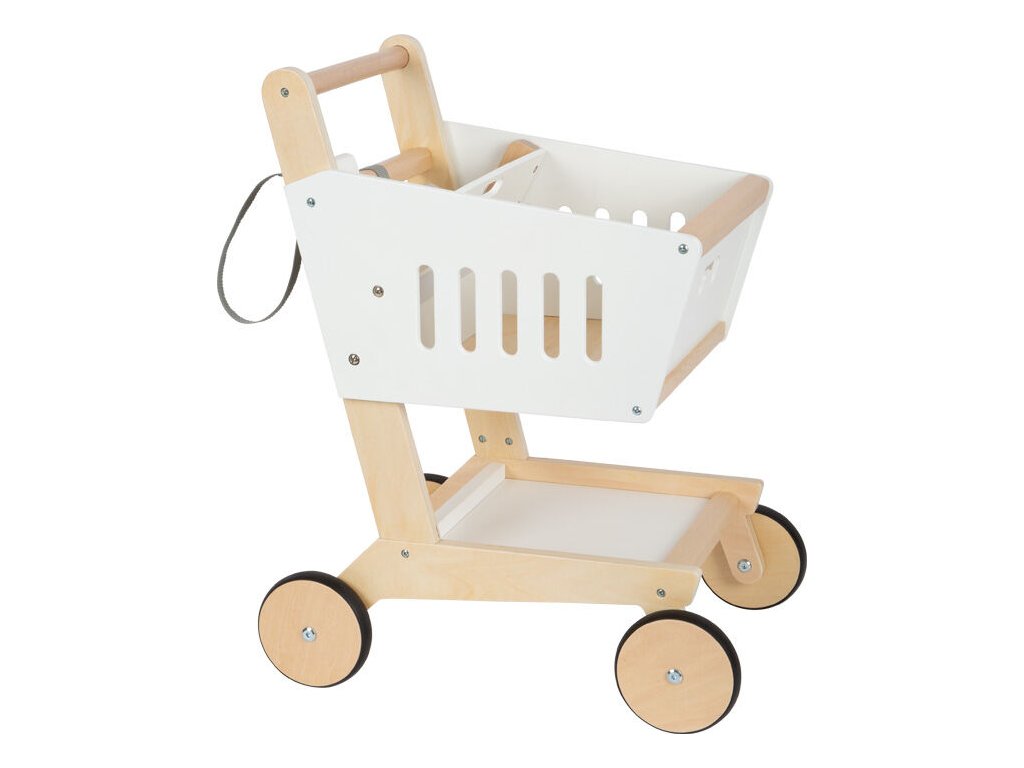 Tento nákupní vozík vyrobený z pevného dřeva má pogumované kolečka pro lepší tišší chod (nezanechávají žádné stopy). Stejně jako v opravdovém supermarketu můžete do držáku vložit magnetický čip. Prostorný košík nabízí dostatek místa pro všechny vaše potřeby. Pokud je váš nákupní seznam opravdu velký, nebojte se využít i spodní část. Prohlubeň v přední straně vozíku lze využít k zavěšení nákupní tašky. Hlavní vlastnosti: genderově neutrální barevnostrozvíjí představivost a kreativitupodporuje komunikaci a sociální schopnostitichý a snadný chod