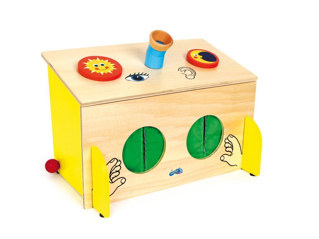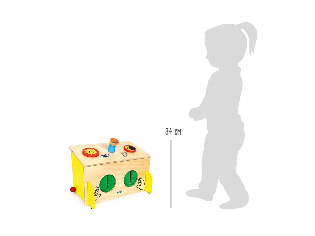 Trénujte všechny své smysly! Tento krásný box je vyroben z přírodního a barevného lakovaného dřeva, najdete v něm dva otvory pro ruce, které jsou překryty textilem, díky kterým budou děti trénovat hmat. Dále jeden otvor s kaleidoskopickým sklíčkem, který potrénuje zrak, a také trychtýř k naslouchání. Co by mohlo být uvnitř? Odklopná víčka svrchních otvorů mají pěkný malovaný motiv slunce a měsíce. Děti se naučí poznávat různé tvary, hmotnosti, materiály... Hlavní vlastnosti: multifunkční, trénuje všechny smyslylakované dřevo a textilodklopná víčka s motivem slunce a měsíce