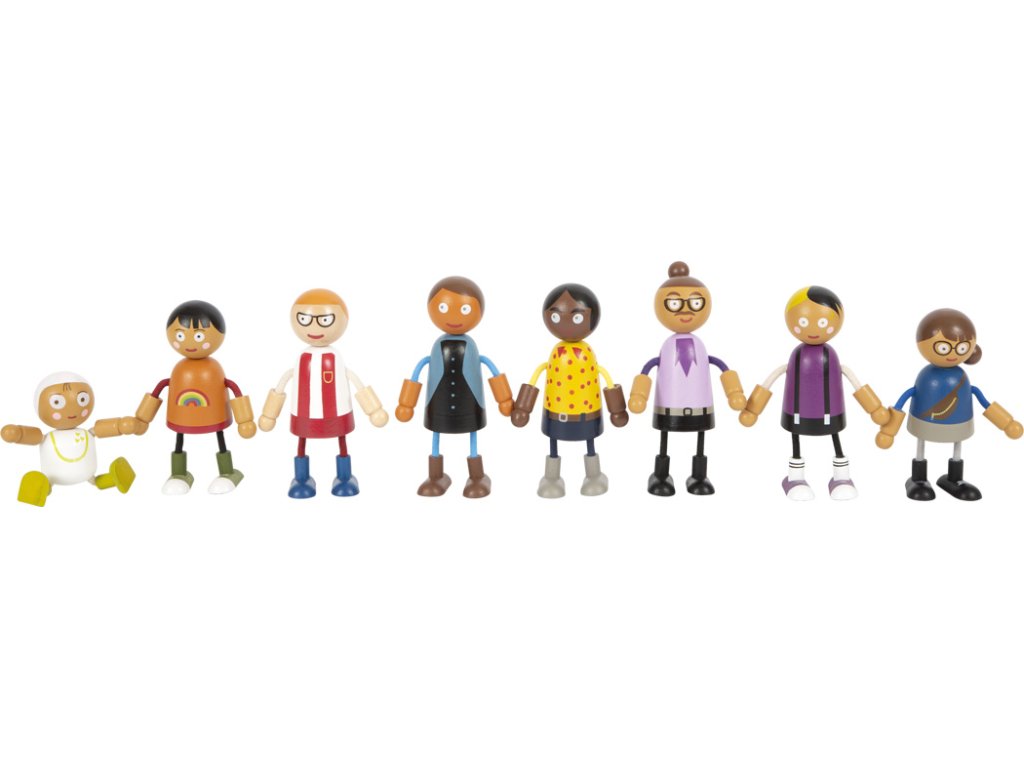 Tato velká rodina dřevěných ohýbacích panenek je vhodná do každého domečku pro panenky. Skládá se z 8 rodinných příslušníků různého pohlaví a věku. Ohýbací panenky mají hlavu a tělo vyrobenou z masivního dřeva, zatímco jejich ruce a nohy jsou textilní, ohebné. Dva páry rodičů, tři děti a miminko v nosítku, které lze připevnit k ostatním ohýbacím panenkám, nabízejí spoustu různých herních možností. Aktivní hraní rolí učí děti zábavnou formou, jak rozmanitý může být životní styl. Hraní rolí podporuje rozvoj identifikace, komunikace, představivosti a sociálních i emocionálních dovedností. Ohýbací panenky jsou svou velikostí snadno uchopitelné pro malé dětské ručičky. Ideální doplněk k městské vile s domečkem pro panenky (11802) kompaktní městské vile (12277). Hlavní vlastnosti: 8členná flexibilní rodinka panenek podporuje představivost, kreativitu a sociální dovednostirealistická zábava díky ohebným pažím a nohámflexibilní, robustní s bohatými detailyvelikost figurky je snadno uchopitelná pro dětské ruce