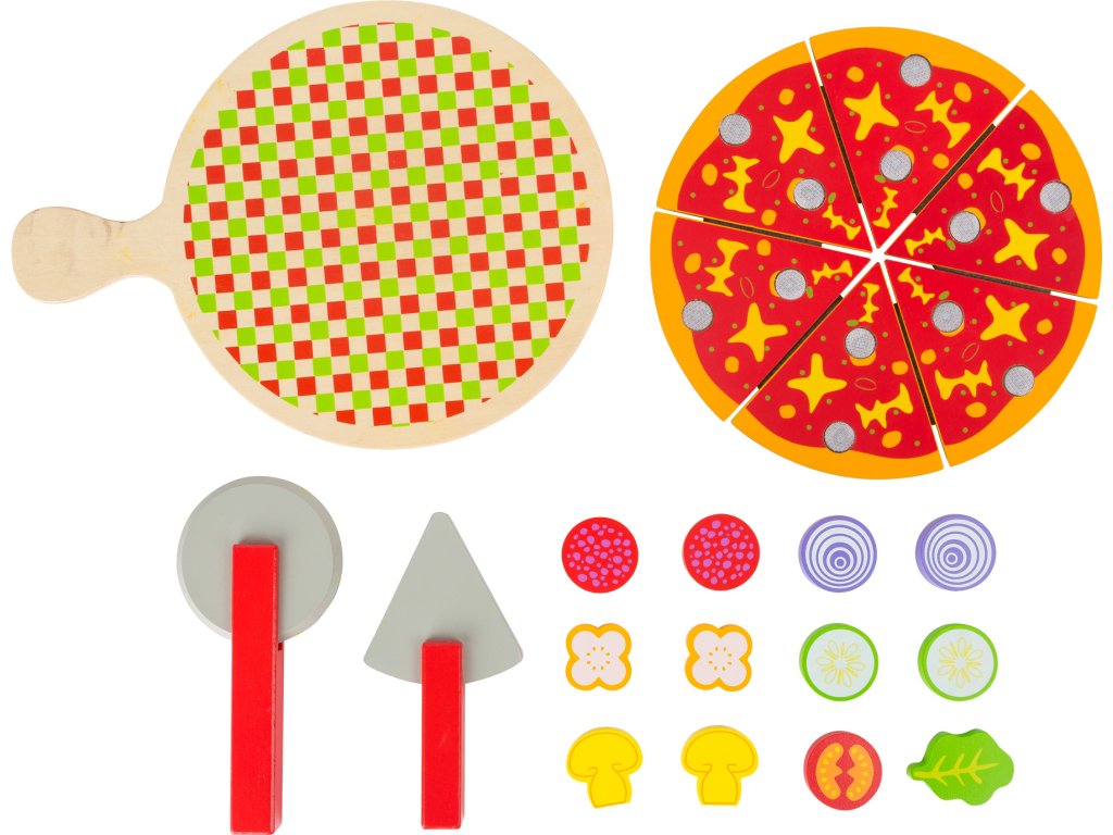 Je čas na pizzu! Tuto dřevěnou pizzu lze kreativně sestavit a vyzdobit zeleninou či salámem. Plátky pizzy jsou spojeny na suchý zip a lze je rozdělit přiloženým kráječem na pizzu. Pokrm lze hladovým hostům prezentovat na dřevěné desce a podávat pomocí lopatky na pizzu. Hlavní vlastnosti: obsahuje 21 ksjednotlivé díly lze propojovat suchým zipemtrénuje motoriku, aktivní hraní rolí a rozvoj sociálních dovedností