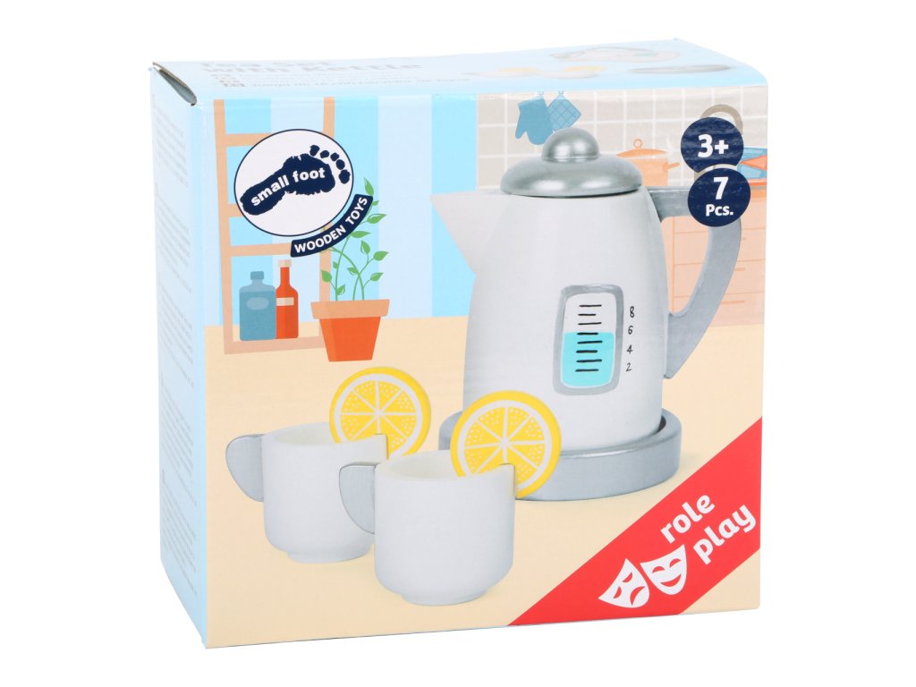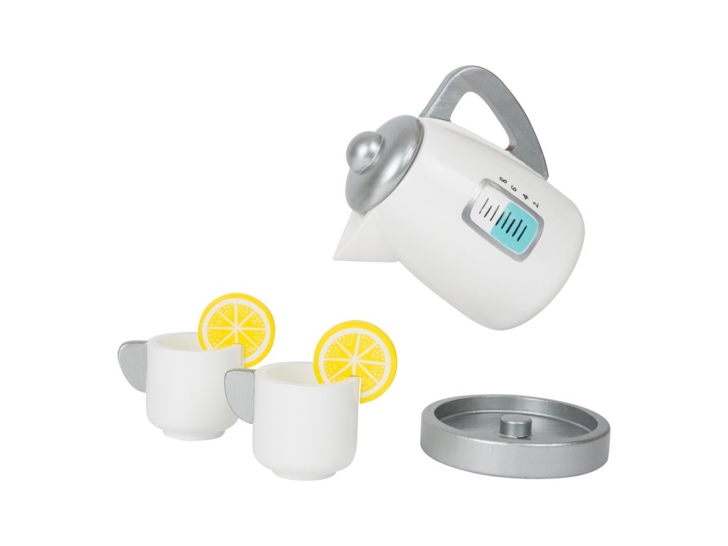 Není nad šálek horkého čaje ozdobený šťavnatým plátkem citrónu! Naučte děti pravidla servisu a společenského chování se soupravou rychlovarné konvice a hrníčků. Skvěle doplní dětské kuchyňky, jiné servisy, snídaňové sady, nebo makety pečiva a zákusků. Součásti jsou vyrobeny z kombinace masivního dřeva a silné překližky, hračka díky tomu může nabídnout vysokou odolnost a životnost. Hlavní vlastnosti:konvice s víčkem a podstavou, 2 šálky a 2 citrónyrobustní a odolné dřevěné provedení