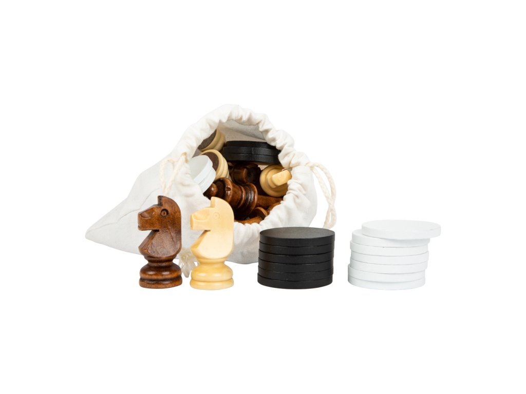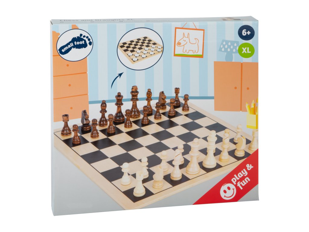Při hře v šachy nebo dámu na velké dřevěné hrací desce je zapotřebí taktika, zručnost a promyšlené tahy. Mimořádně velké herní figurky usnadňují jejich umístění i hráčům s malýma nebo nejistýma rukama. Dodává se s látkovou taškou. Kdo udělá nejlepší tah? Tyto dvě extra velké klasické deskové hry slibují dvojnásobnou zábavu pro malé i velké. Dvě společenské hry, které vyžadují logické myšlení a soustředění a zároveň nabízejí maximální herní zábavu. Klasicky navržené šachové figurky a figurky na dámu lze bezpečně uložit do přiloženého látkového sáčku. Tato sada klasických her zaručuje velkou zábavu při hraní a nesmí chybět v žádném dětském pokoji. Hlavní vlastnosti: procvičuje zručnost, koncentraci a logické myšlenívelké herní figurky pro snadné uchopení2 v 1praktické balení