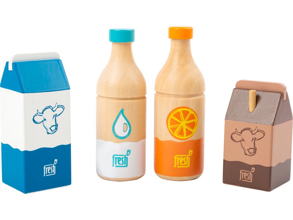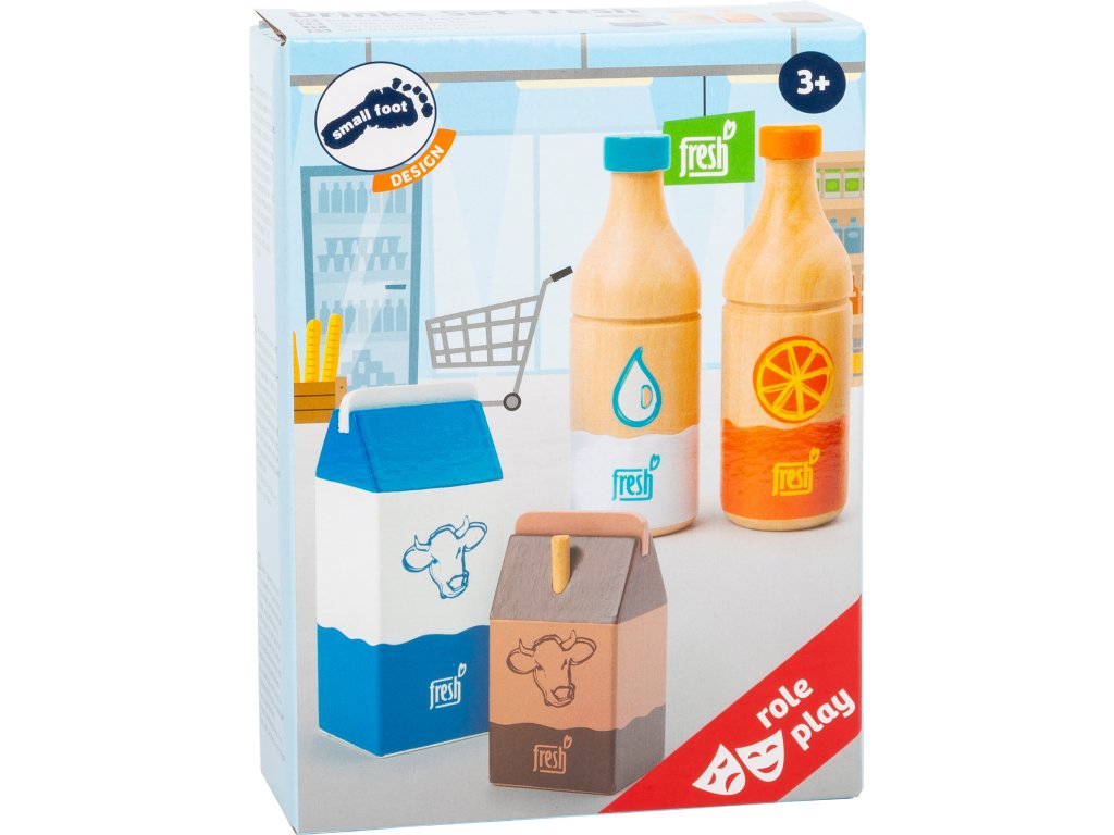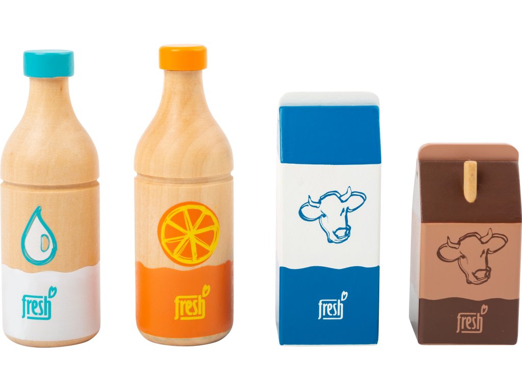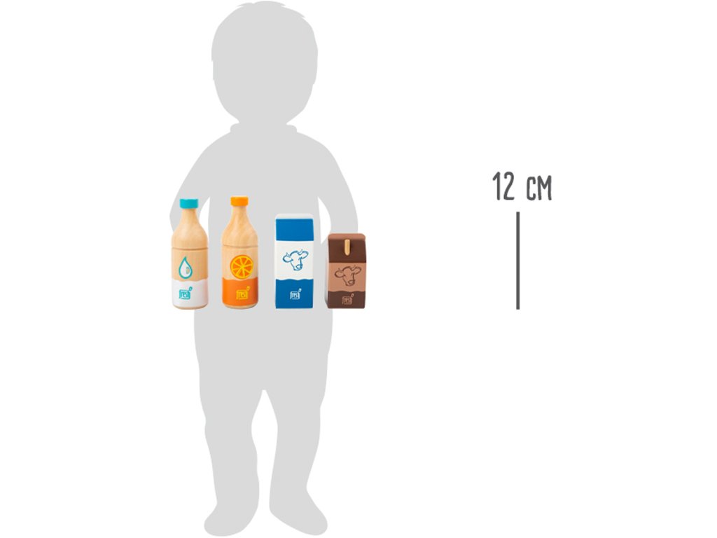 Čtyři nápoje okamžitě zaženou žízeň! Tato čtyřdílná dřevěná nápojová sada obsahuje láhev pomerančového džusu, láhev vody, krabici čerstvého mléka a malé kakao s brčkem. Výstižné ilustrace a ikonické barevné provedení je snadno čitelné. Dřevěné provedení zaručuje dlouhotrvající kvalitu. Hlavní vlastnosti: obsahuje 4 ks nápojůpodporuje hraní rolí v kuchyňkách a obchodech