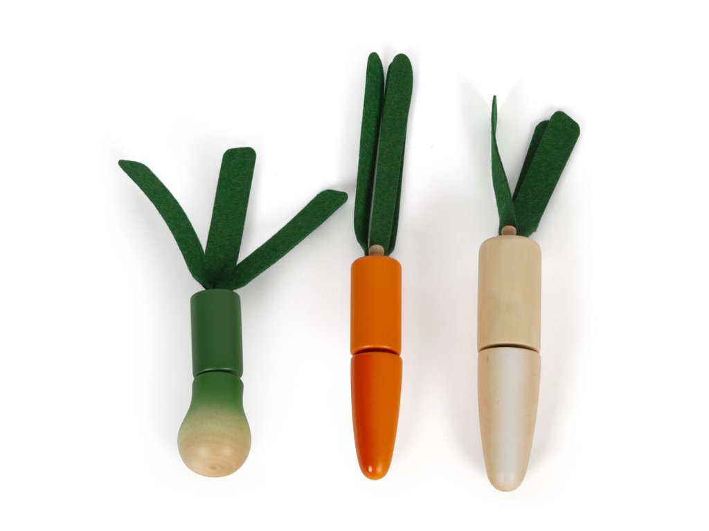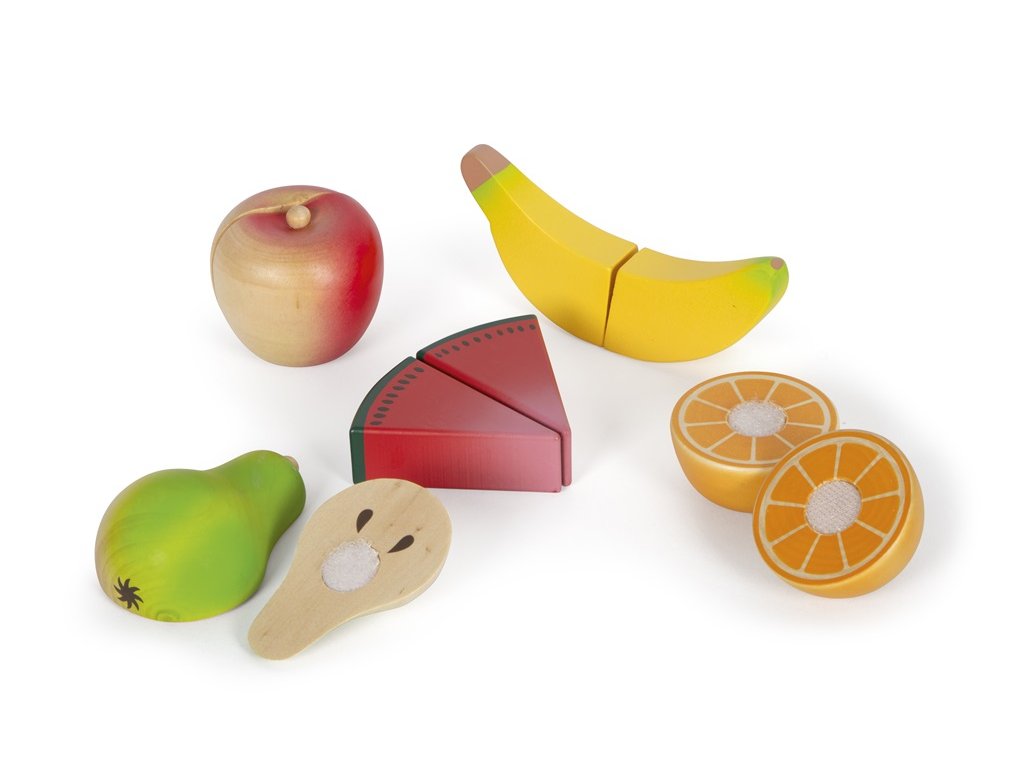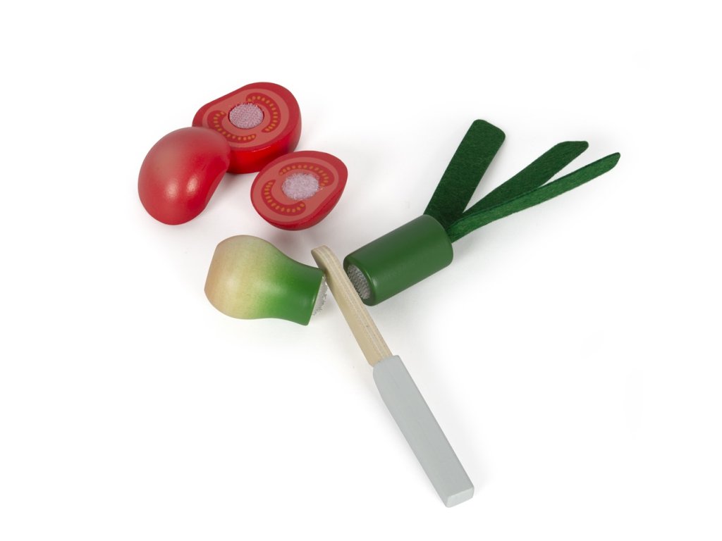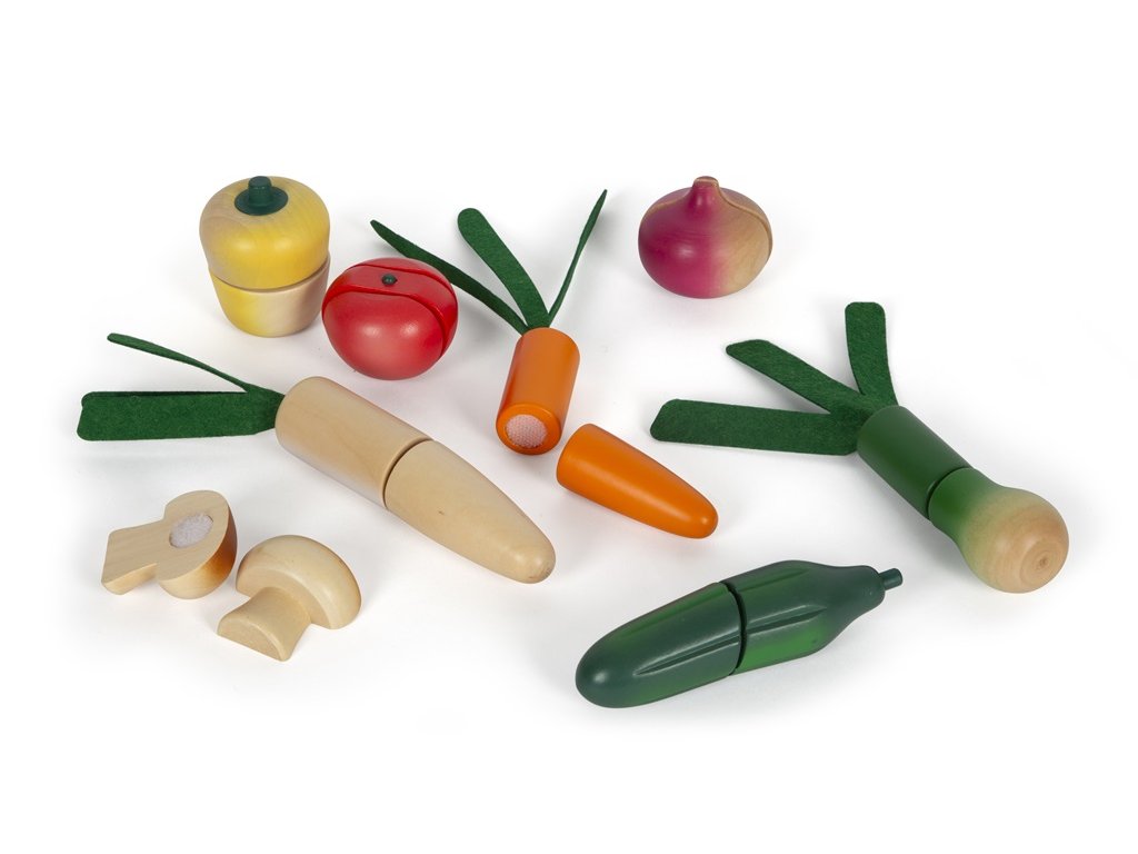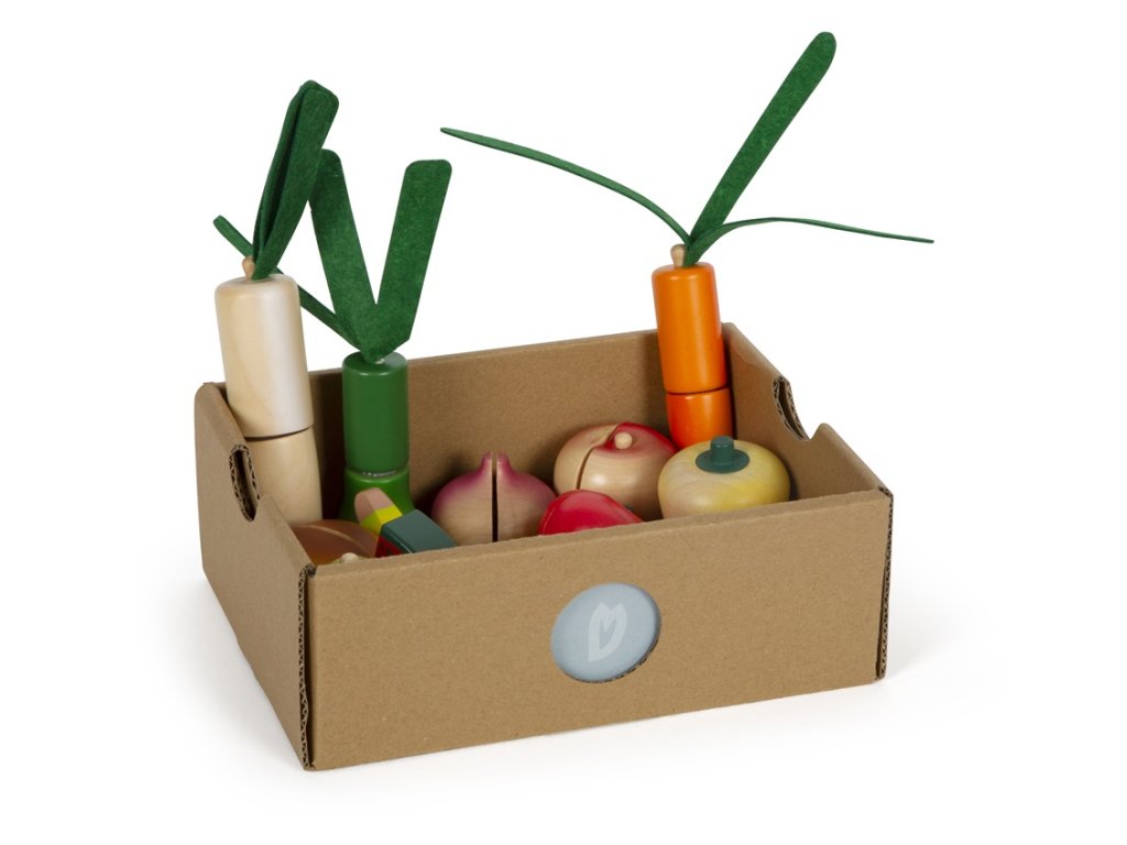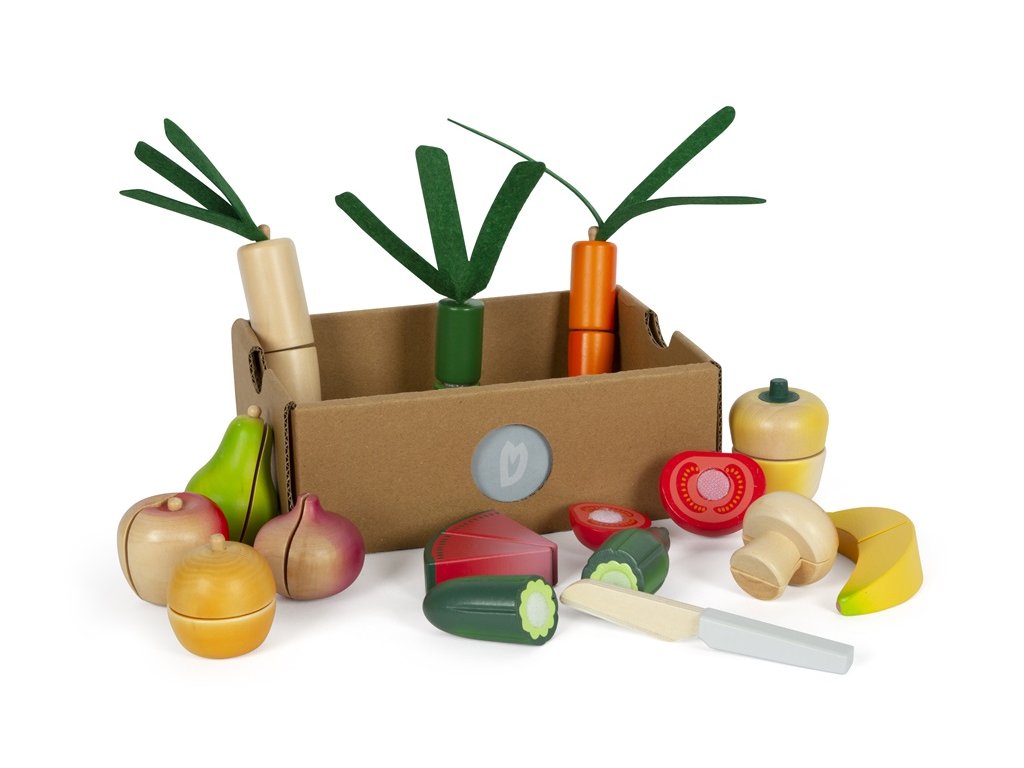Tato velká sada potravin v praktické bedýnce je nejen nezbytným doplňkem každé kuchyňky, ale také naučí děti rozpoznat základní druhy ovoce a zeleniny a dalších potravin. Pro výrobu bylo použito robustní dřevo a vše je realisticky zpracováno. Potraviny jsou spojeny suchým zipem a děti je mohou snadno „rozkrojit“ pomocí přiloženého nože. Sada obsahuje dřevěný nůž, rajče, okurek, mrkev, jablko, banán, hříbek, papriku, cibuli, pórek, pomeranč, meloun, hrušku, ředkev (pastinák). Opakovaně použitelný obal učí děti zábavnou formou odpovědnosti k životnímu prostředí - omezit odpadky a plýtvání, znovu věci použít, recyklovat. Hlavní vlastnosti: vhodné do dětské kuchyňkydíky suchým zipům lze potraviny „nakrájet“učí děti odpovědnosti k životnímu prostředípodporuje kreativní a nápadité hraní
