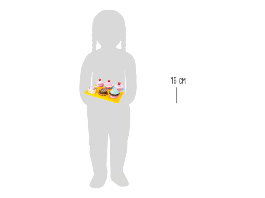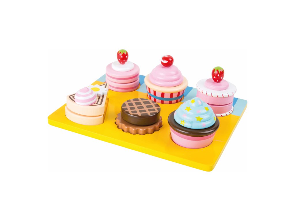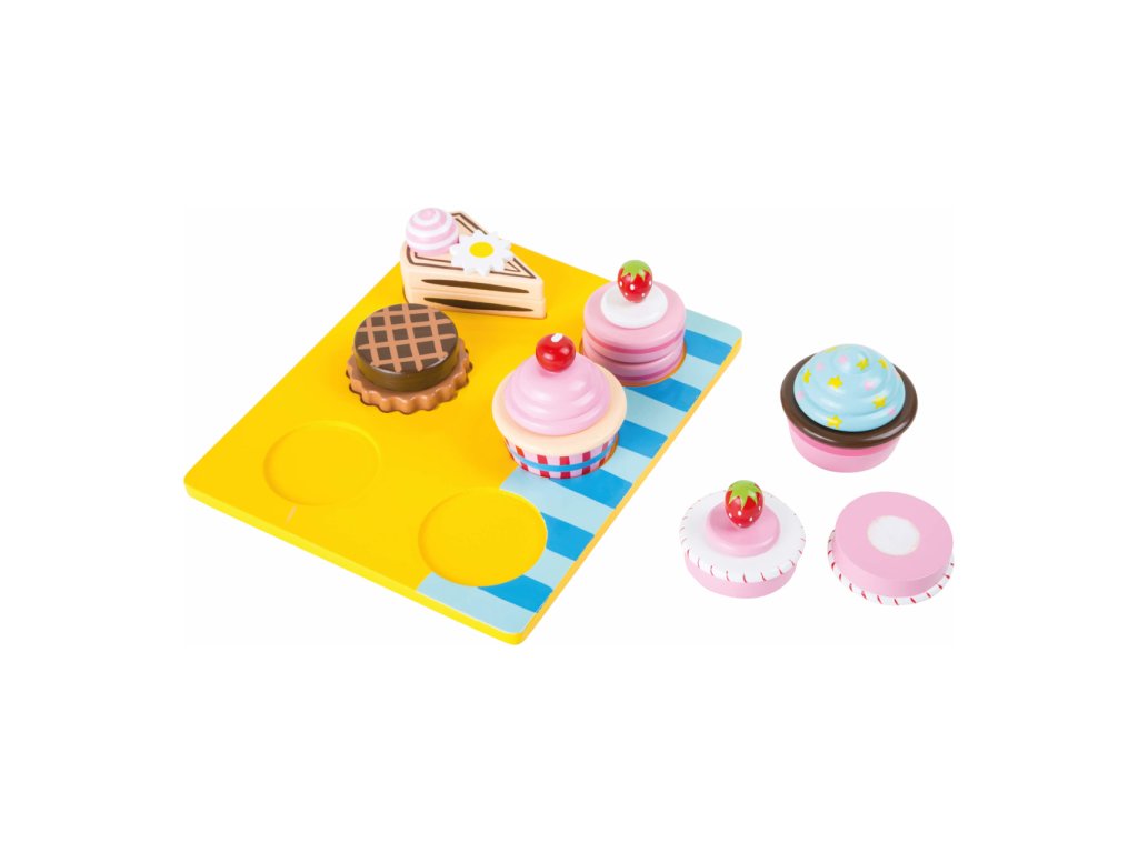 Nebraňte se a nabídněte si, s těmito sladkostmi neztloustnete! Souprava maket rozmanitých zákusků pro všechny mlsné jazýčky. Jejich pomocí lze zpestřit hry na hostitele podávající občerstvení váženým návštěvám, nebo na prodavačky a prodavače, různé stánky a obchody. Prostřednictvím těchto her si mohou děti osvojit způsobné společenské chování či pravidla servisu, a rozvíjet tak cenné komunikační dovednosti. Každý zákusek je sestaven ze dvou dílů spojených suchým zipem, které lze mezi sebou kombinovat. Děti tak mohou dát volný průchod své fantazii i při přípravě. Všechny součásti jsou vyrobeny z odolného dřeva a dekorovány pestrými nezávadnými barvami. Hlavní vlastnosti: 13 dílů celkem; podnos a 6 zákusků2 dílné zákusky možno vzájemně kombinovatrobustní a odolné dřevěné provedení