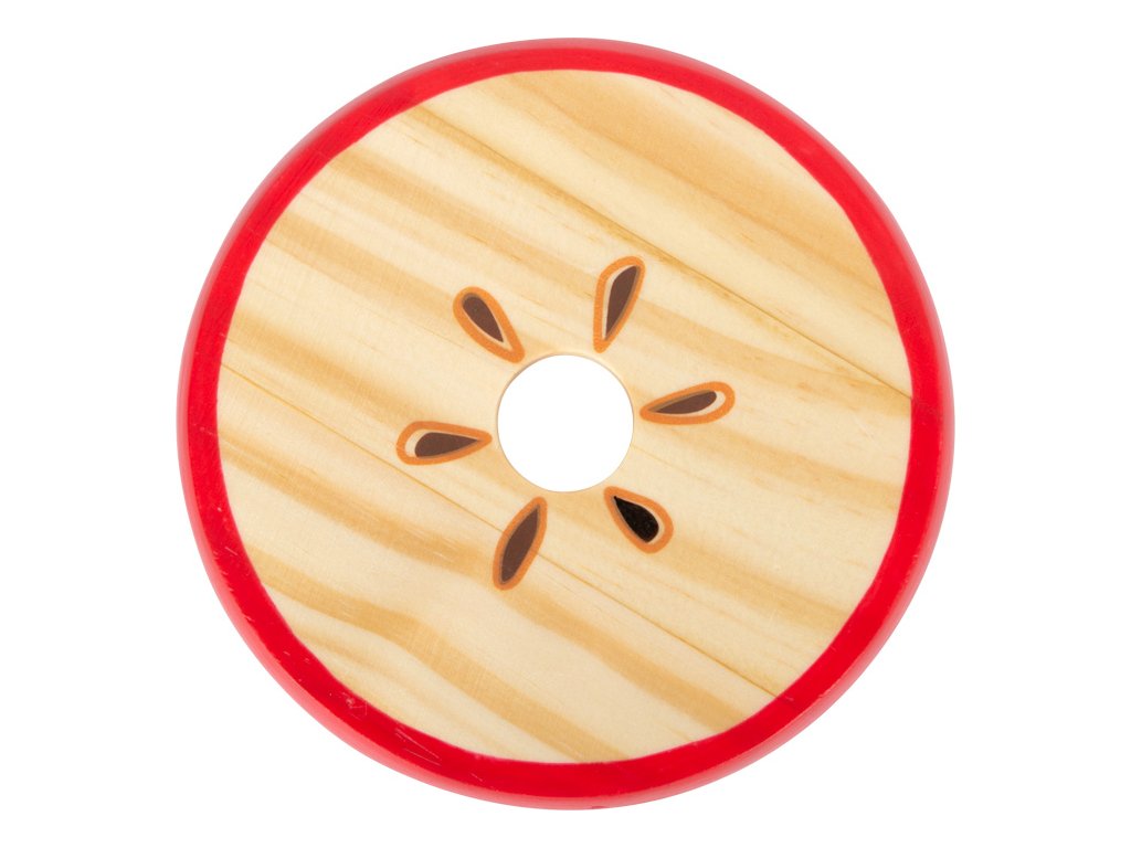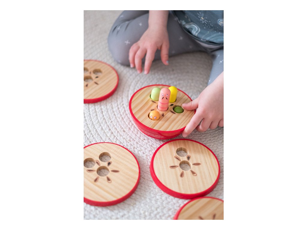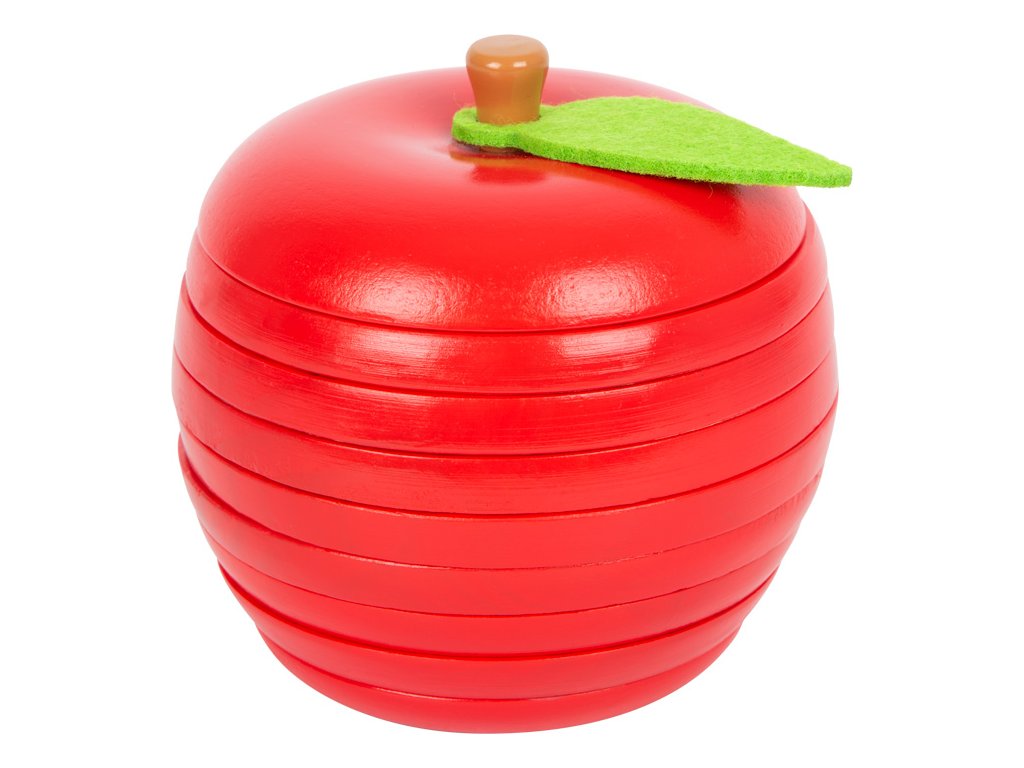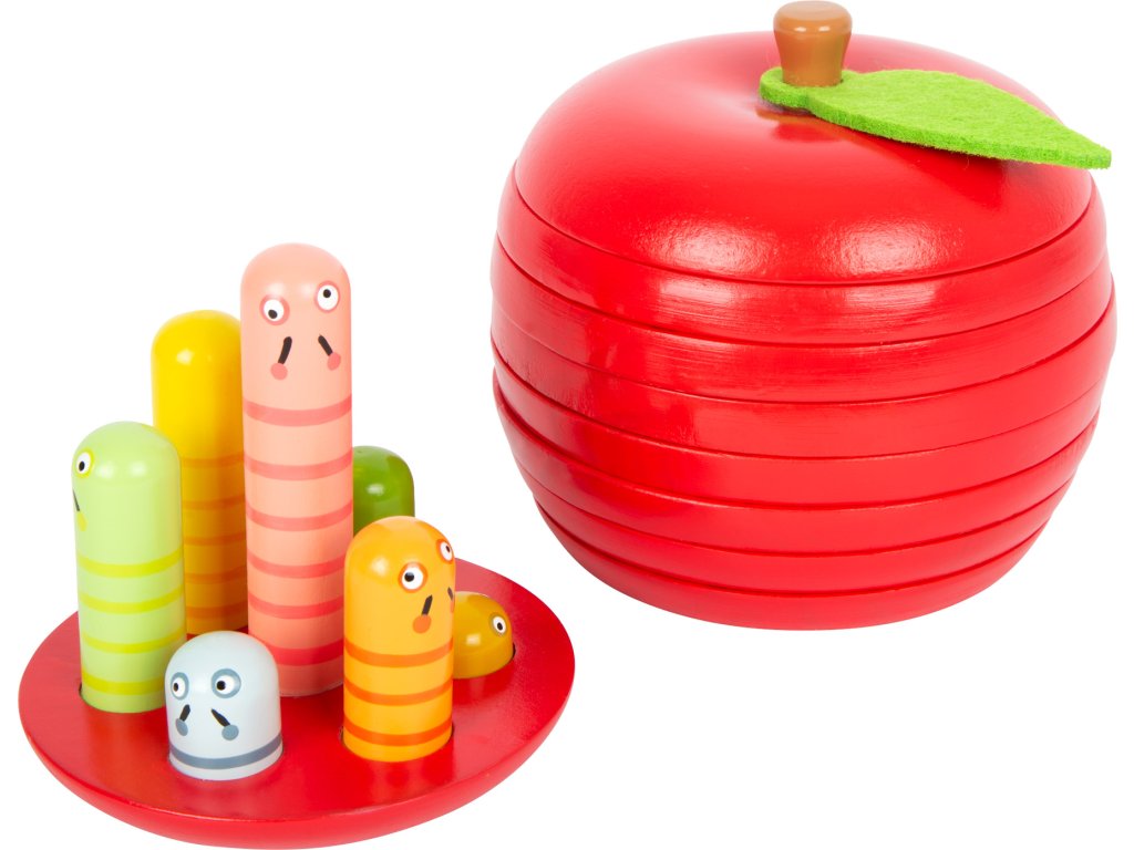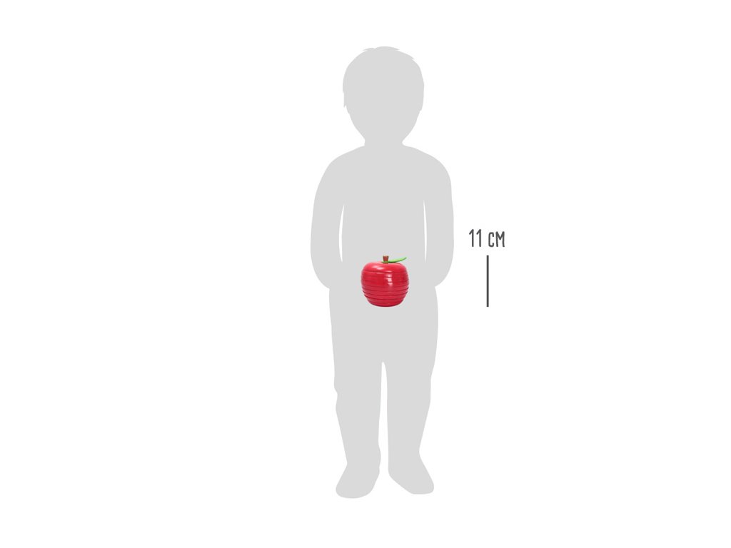 Dřevěná, 9 dílná skládačka jablka zdobeného plstěným lístkem, v jasných barvách. Procvičujte jemnou motoriku, koordinaci zraku a rukou i prostorovou představivost, aniž byste ubírali na zábavě. Každý červík vykukující ze základního dílu má jinou výšku, skládejte jablko po vrstvách tak, aby počet děr ve vrstvě odpovídal počtu právě vykukujících červíků. Sestavené jablko je ozdobou každé police. Hlavní vlastnosti: 9 dílůvhodné i jako dekoracerobustní a odolné provedení