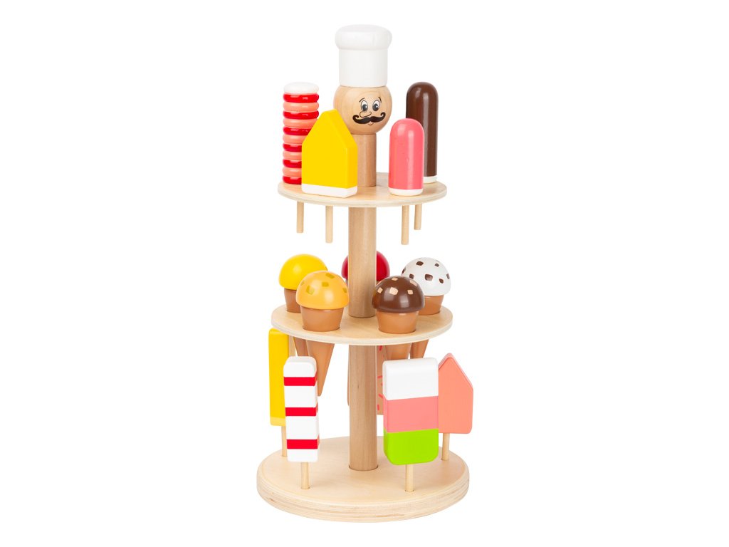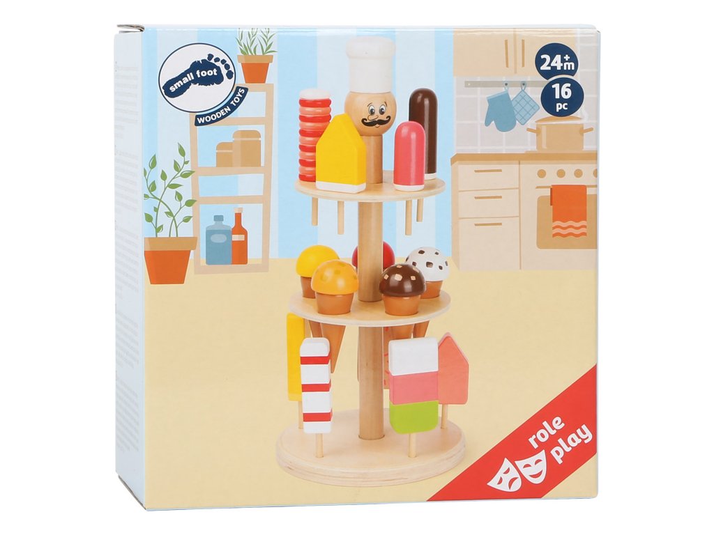 Mňam ... zmrzlina! Tento láskyplně navržený stojan na zmrzlinu z masivního dřeva splňuje všechna zmrzlinová přání. Zde si děti mohou vybrat svou oblíbenou zmrzlinu. Ať už jde o nanuky nebo zmrzlinu ve vaflovém kornoutku - není to snadné rozhodnutí! Různé příchutě zmrzliny lze snadno dát do stojanu na zmrzlinu, což z nich činí skutečný poutač na prodejním pultu v obchodě nebo v dětské kuchyňce či kavárničce. Hlavní vlastnosti: Podporuje sociální dovednosti a jemnou motoriku dětí