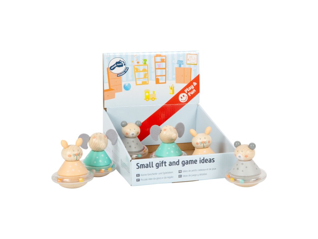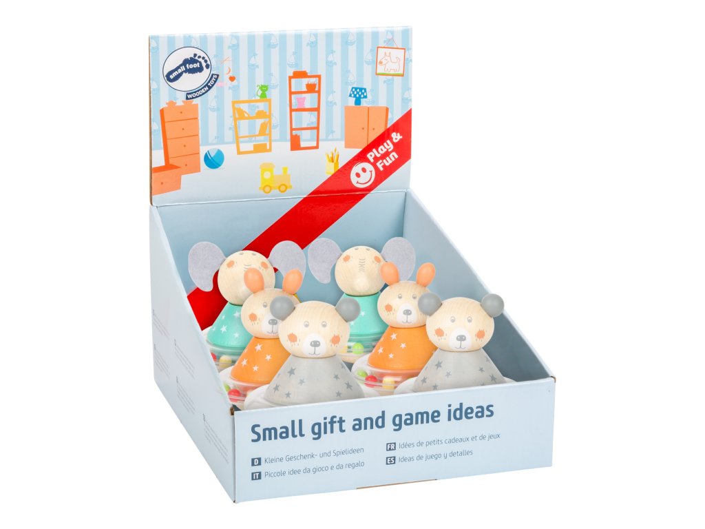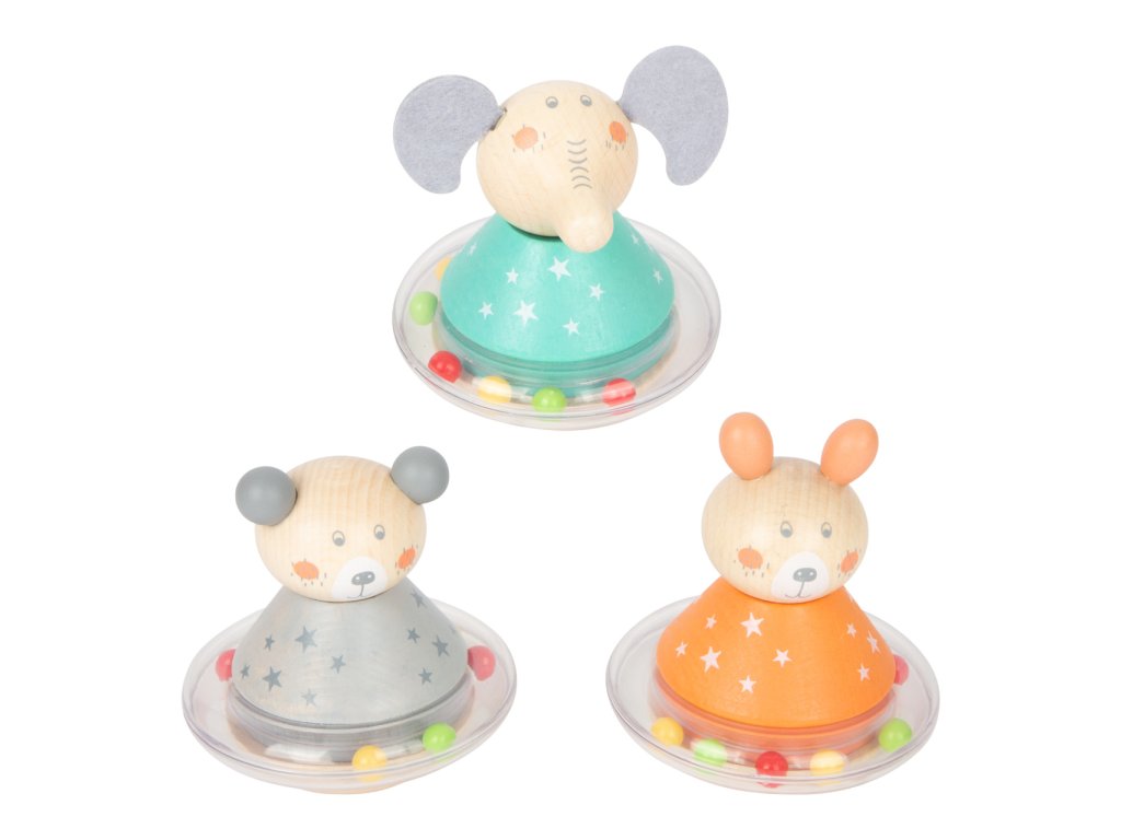 Zvířátko, postav se! Když do roztomilých dřevěných zvířátek strčíte, začnou se houpat dopředu a dozadu, zároveň se perličky kolem jejich pasu začnou pohybovat a vydávat pěkný zvuk. Plastový kroužek s perličkami je otočný, hlava zvířat je připevněna gumičkou. Medvěd, králík a slon jsou zároveň hmatací hračkou i chrastítkem.