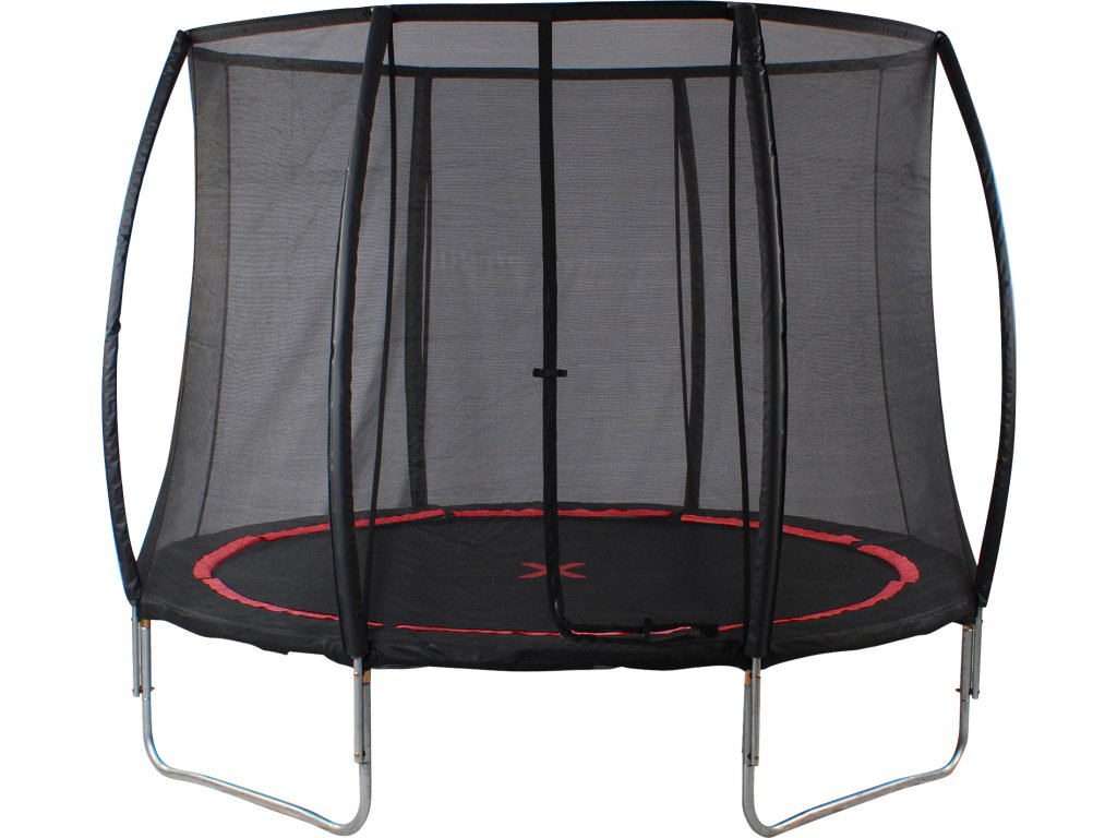 Černá trampolína se sítí, s červeným označením, které odděluje část ke skákání od ochranných prvků. Sférický design konstrukce tyčí zajišťuje bezpečnost při skákání, tyče se totiž nedotýkají ochranné sítě. Navíc jsou tyče polstrované, což znamená ochranu navíc. Skvělý doplněk do každé zahrady či na hřiště. Nosnost do 120 kg umožní zábavu nejen dětem, ale i dospělým. Pouze pro soukromé použití!