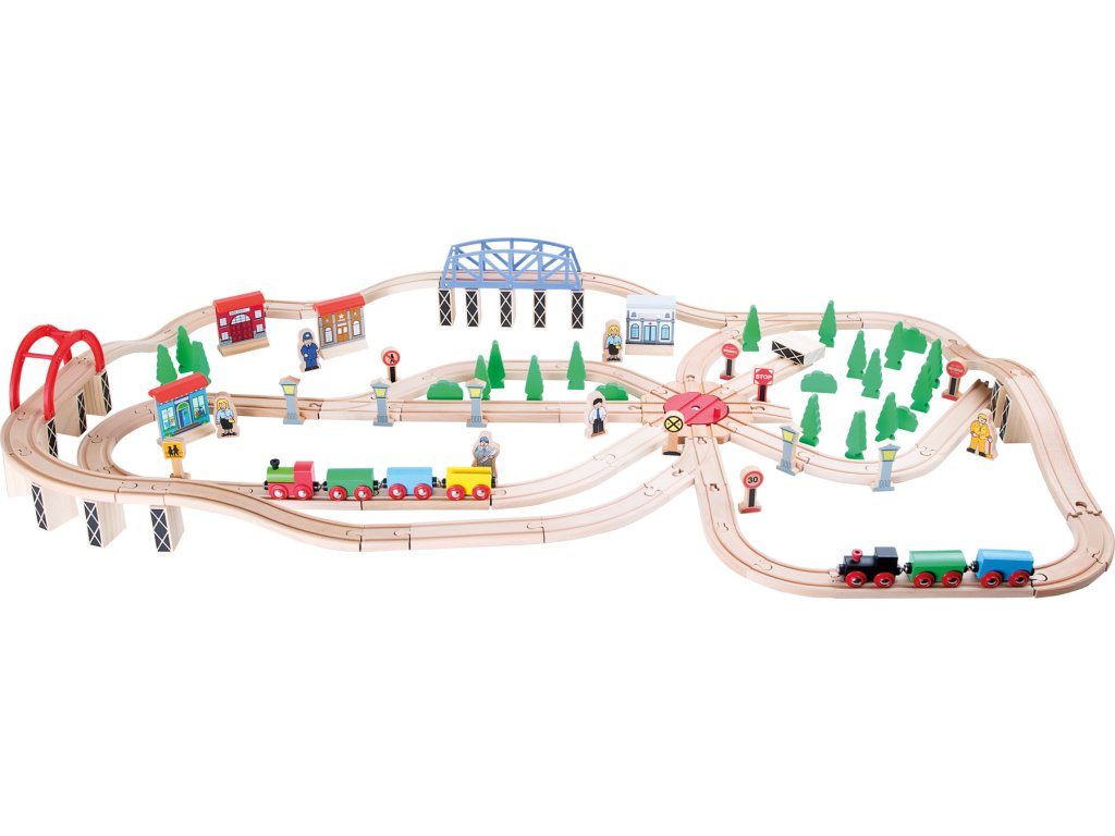 S touto dřevěnou železniční soupravou ožije život na kolejích. Robustní dřevěné koleje a výhybky umožňují vagonům bezpečně dojet do cíle. Krajinu doplňují stromy a různé dřevěné budovy, mosty, postavičky, lokomotivy a vagóny. Hlavní vlastnosti: Materiál: dřevoObsahuje 140 ksvhodné od 3+