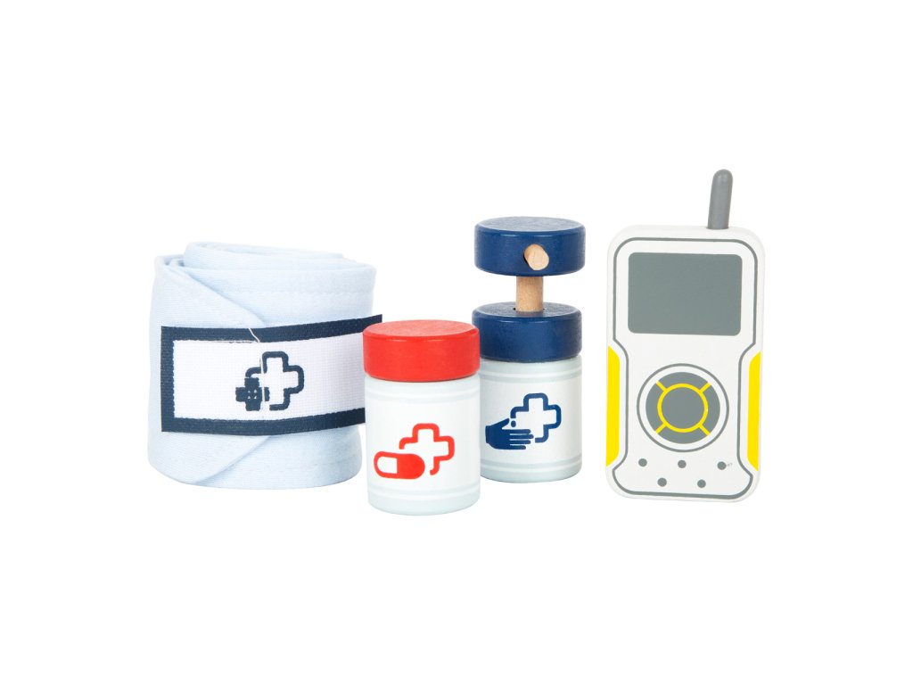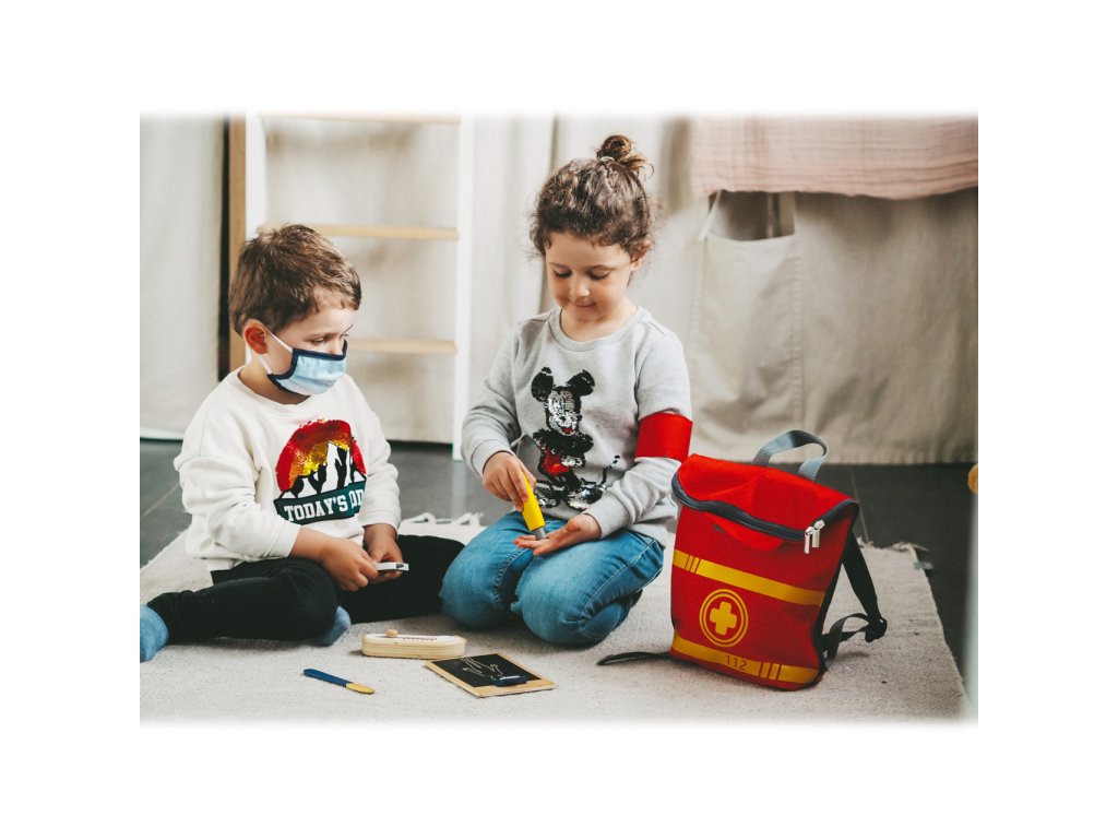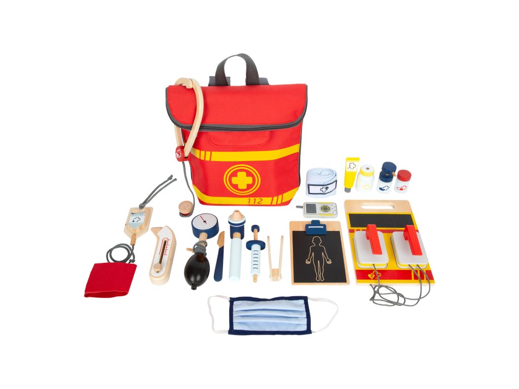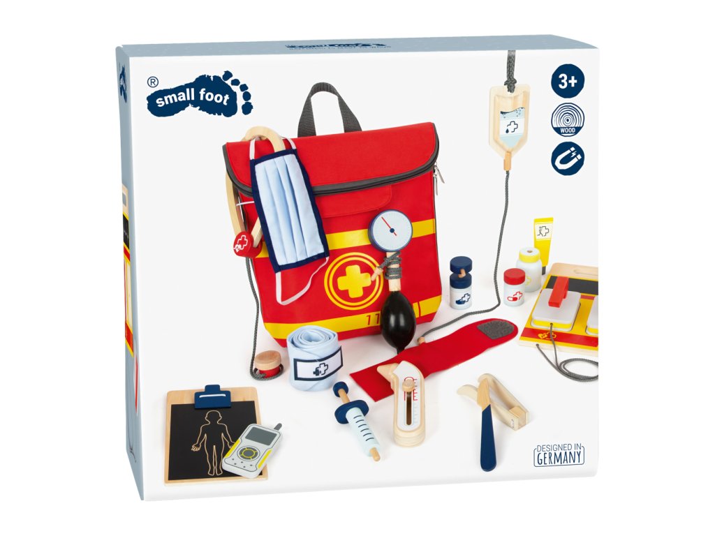 Vše pro naléhavé případy! Tento realistický batoh pro záchranáře má jasné barvy, nastavitelné popruhy a mladí záchranáři v něm najdou všechny „opravdové“ lékařské pomůcky. Dvojitý zip a uvnitř elastické kapsy nabízí mnoho úložného prostoru a rychlý přístup k záchranářským pomůckám z pevného dřeva. Nejlepšími doplňky jsou zřejmě tlakoměr s manžetou a balónkem, otoskop s lupou a defibrilátor s tabulkou pro křídu. Tento inovativní a obsáhlý set lékařských hraček obsahuje mnoho „opravdových“ lékařských nástrojů a přístrojů, s kterými si děti opravdu vyhrají, to vše v jednom batohu. Dále v batohu najdete teploměr, dětské textilní roušky, ampule s otvorem pro vložení stříkačky pro případ nouze, dezinfekční sprej s pumpičkou, infúzi, náplasti na suchý zip, stetoskop, injekční stříkačku s pohyblivým mechanismem, skalpel, pinzetu a rádio. S těmito pevnými hračkami mohou děti objevovat a zkoušet, jaké je to být záchranářem. Ilustrace na lékařských pomůckách dětem poradí rozeznat nástroje a také jim možná zjednoduší jejich použití. Hlavní vlastnosti:tlakoměr s manžetou a balónkem, lze také použít pro zajištění infúzeotoskop s opravdovou lupouteploměr s nastavitelnou teplotouznovu použitelné a pratelné dětské textilní rouškydefibrilátor s křídou pro zaznamenání srdečního tepudalší vybavení: ampule s otvorem pro vložení stříkačky pro případ nouze, dezinfekční sprej s pumpičkou, náplasti na suchý zip, lahvička na léky se šroubovatelným víčkem, injekční stříkačka s pohyblivým mechanismem, stetoskop, skalpel Ocenění hračky:ToyAward 2022