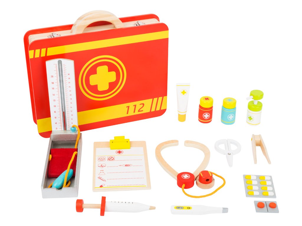 Trendy lékařská souprava v kufříku pro mladé doktory a doktorky. Všechny předstírané lékařské úkony u lékaře, nebo na pohotovosti, zvládnou děti v dětském pokojíčku s tímto dřevěným lékařským kufříkem.Početné náčiní splní přání každého mladého lékaře. Injekční stříkačky a nádobky na masti jsou dokonce vybaveny funkcí pumpy. Takto si mohou všechny panenky a medvídci nechat změřit krevní tlak a ošetřit drobné ranky. Všechna ošetření lze nakonec zapsat do praktické lékařské dokumentace. Komplexní vybavení včetně tlakoměru, lékařské dokumentace, stetoskopu, pinzety, teploměru, stříkačky, nůžek, dávkovače dezinfekčního roztoku s pumpičkou. Obsahuje také tubu na mast, nádobky na tablety a blistrové balení tablet. Hračka dětem pomůže s rozvojem sociálních dovedností a vypravěčství. Další, prosím! Hlavní vlastnosti: lékařská souprava se spoustou dřevěného lékařského vybavenípružné elastické pásky a oddělené přihrádky udrží léky a lékařské vybavení na místě klasické doktorské symboly a kresby, které jsou pro děti snadno srozumitelnépodporuje aktivní hraní a rozvíjí sociální dovednosti