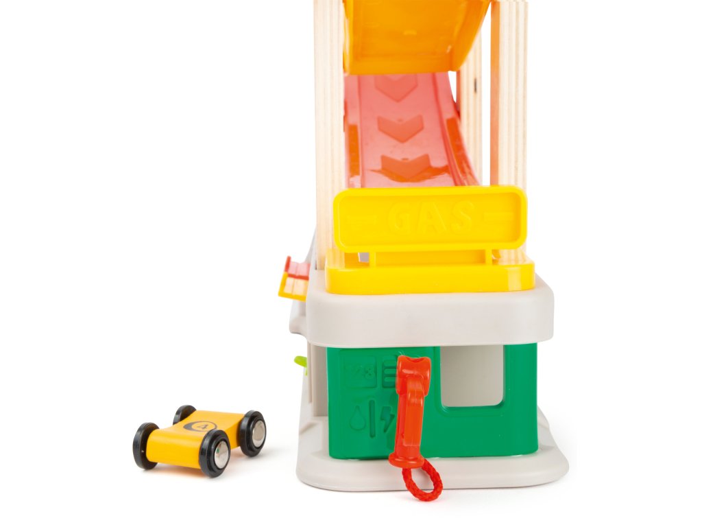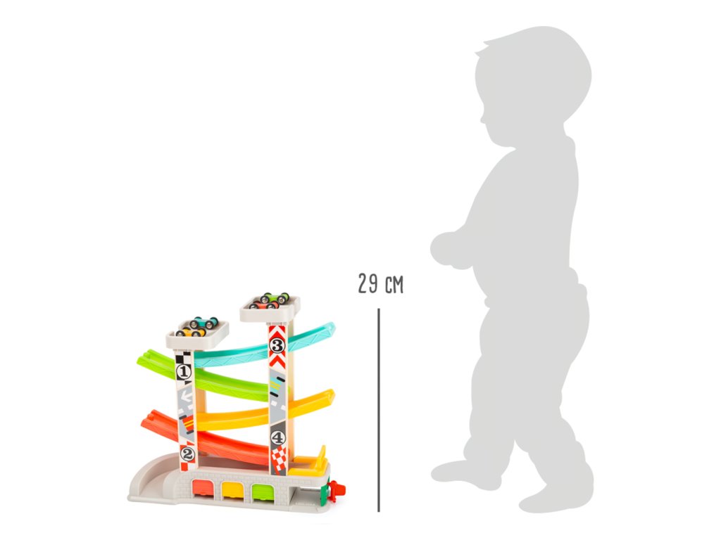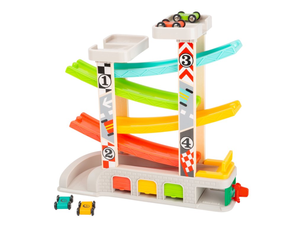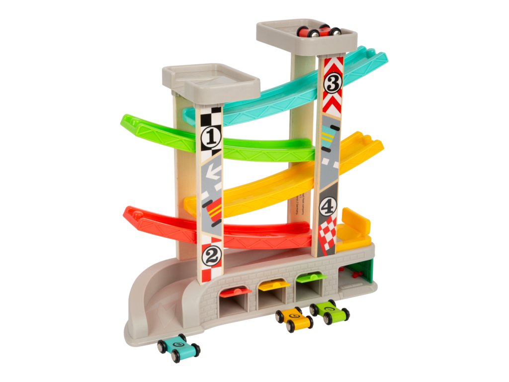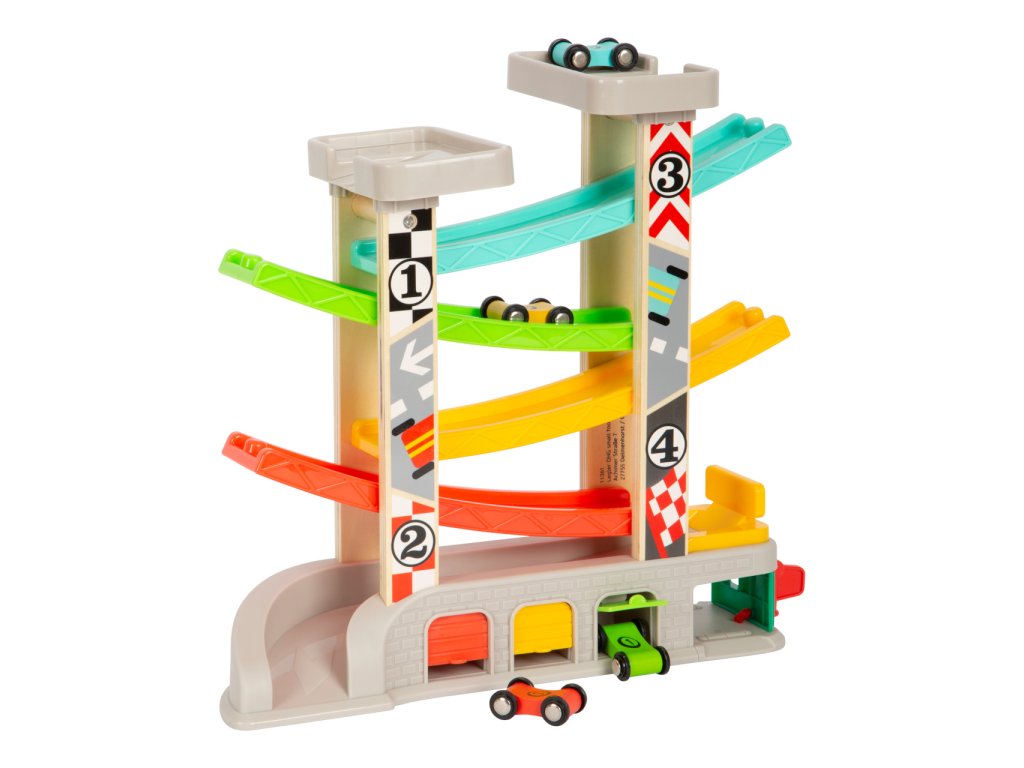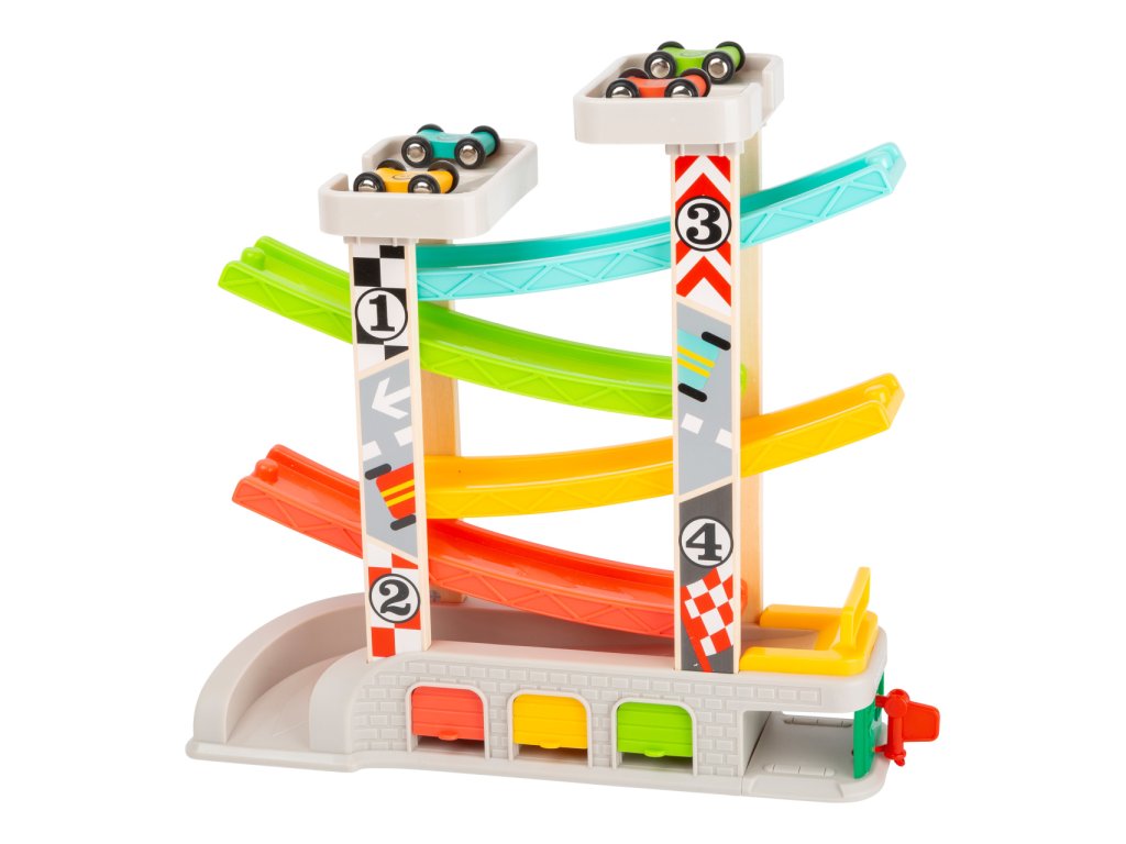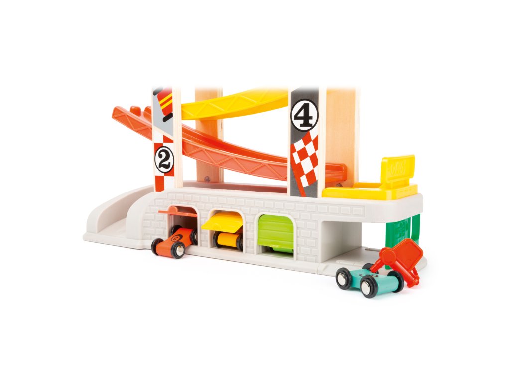 Prohánějte autíčka rychlostní kaskádou, jeden závodník může v těsném závěsu stíhat druhého v atmosféře plné napětí. Dráha je vybavena nejen dvojicí startovacích plošin, ale i zastávkou v boxech, díky které lze rozehrát hry rozvíjející dětskou představivost. U paty dráhy naleznete garáže s otevíratelnými dvířky, kde mohou autíčka odpočívat mezi závody a lze je prakticky využít k úklidu i přenášení hračky. Robustní a odolné provedení kombinuje plastové a atraktivně potištěné dřevěné díly. Díky své jedinečné barevnosti kaskáda snadno upoutá pozornost a podnítí dětskou zvědavost. Hlavní vlastnosti:dráha a 4 různobarevná autíčka3 garáže a tankovací boxatraktivní a odolné zpracování