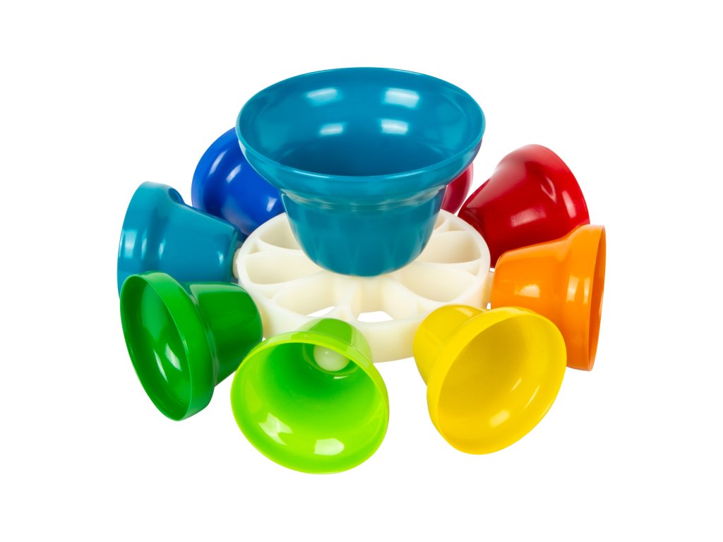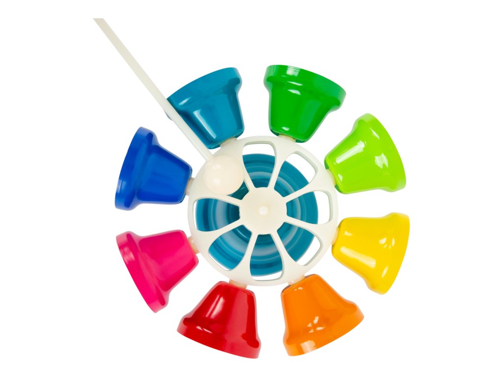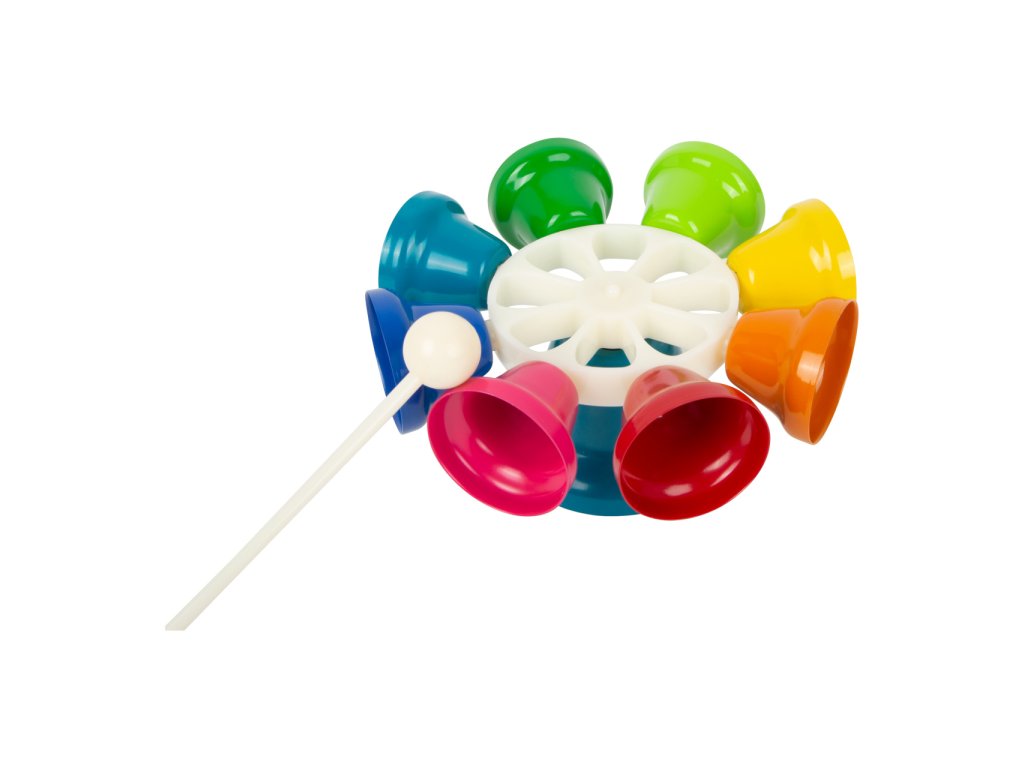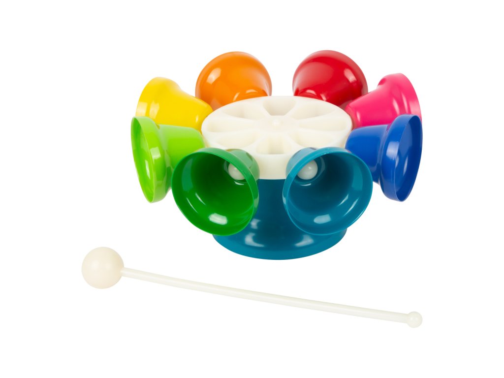 Jiná barva, jiný zvuk! Tento kolotoč má osm barevných zvonečků, každý z nich je naladěn na jinou notu – C, D, E, F, G, A, H, C. Zvoneček můžete držet v ruce nebo jej nechat na stojanu. Paličkou můžete hrát podobně jako na xylofon. V balení naleznete také noty s 8 různými skladbami pro začátečníky a malé děti – noty jsou zaznačeny i barevně. Hudební set podporuje u dětí rozvoj rytmu, hudebního sluchu a také koordinace ruka-oko. V notách najdete písničky jako „Strýček Donald farmu měl“, „Rolničky“, „Třpyť se, hvězdičko“. Perfektní také do školek, prvních stupňů základních škol. Hlavní vlastnosti: osm barevných zvonečků = osm tónůrozvíjí talent dětí, cit pro rytmus a melodiisoučástí balení noty s osmi písněmi