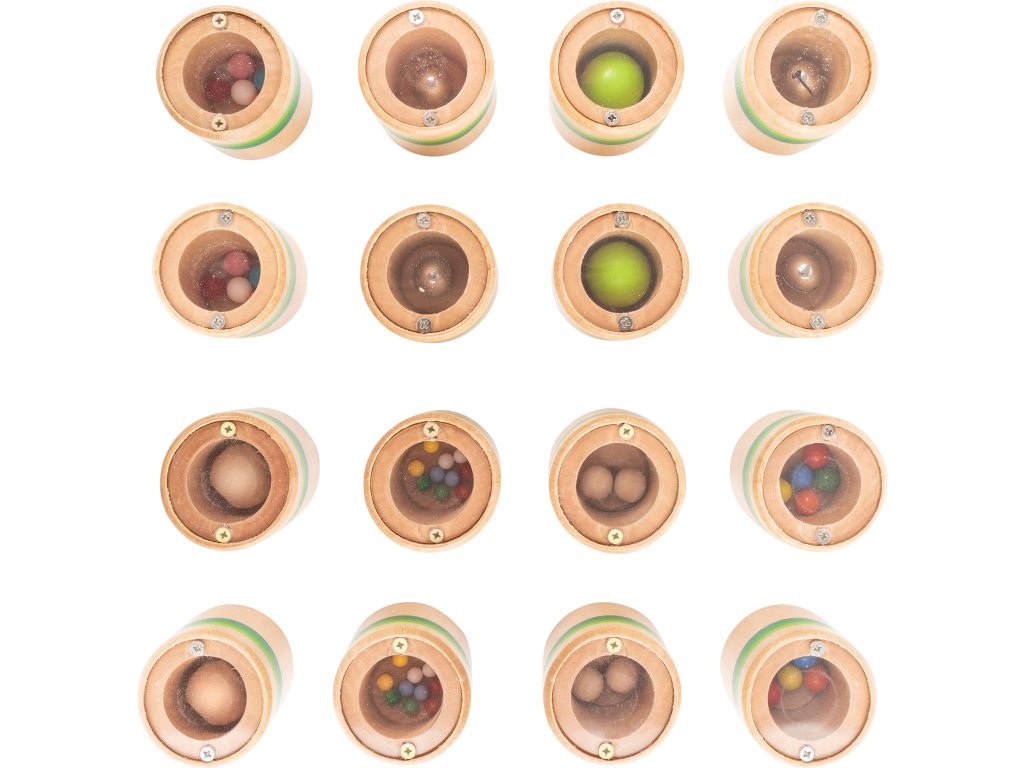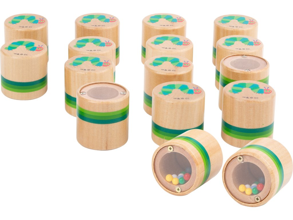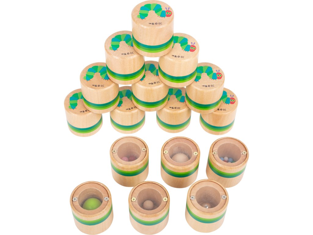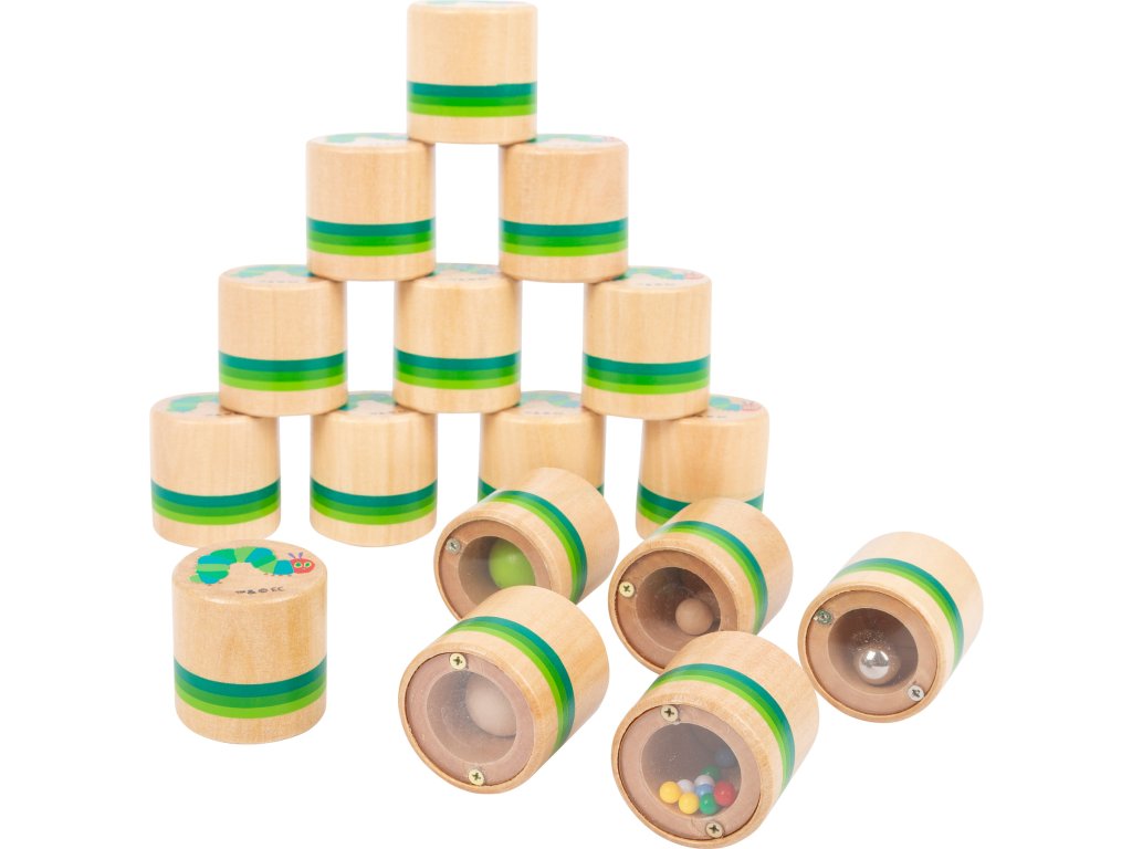 Poslouchejte! S tímto zvukovým pexesem v designu Tuze Hladové Housenky si děti užijí mnoho zábavy. Cílem je rozlišit rozdílné zvuky a pojmenovat je. Třepáním a pečlivým posloucháním mohou hráči rozeznat, které 2 nádobky patří k sobě. Může pomoci také váha nádobky. Vespod najdete okýnko, díky kterého jednoduše zkontrolujete obsah nádobky. Zábava pro celou rodinu! Kdo posbírá nejvíce párů? Hlavní vlastnosti: Dřevo, kov, syntetikaTrénuje pamětTrénuje hmat a sluch