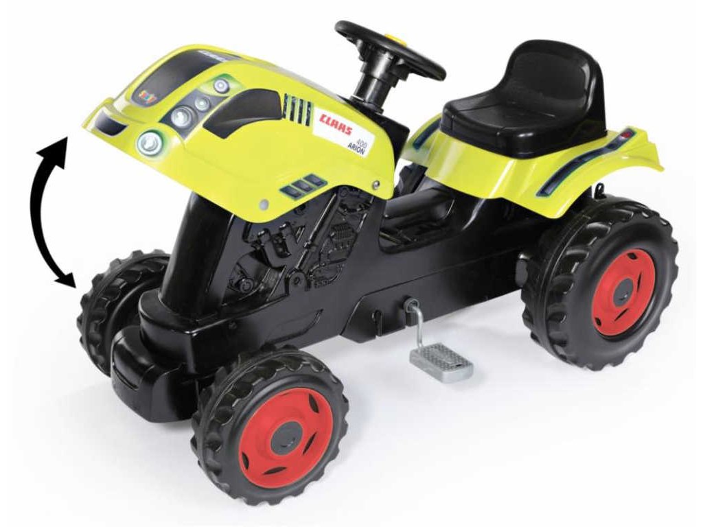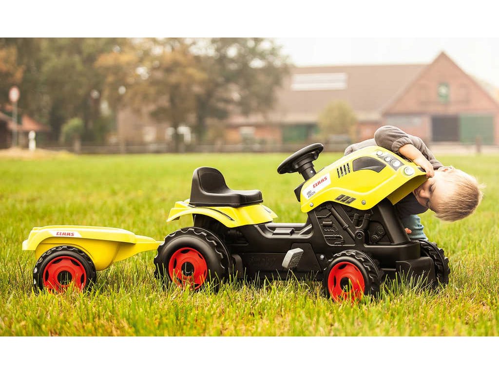 Šlapací traktor CLAAS s volantem a přívěsným vozíkem, který lze odpojit. Odklápěcí kryt motoru. Nastavitelné sedadlo dle výšky dítěte. Klakson na volantu. Vyrobeno z velmi kvalitního plastu.