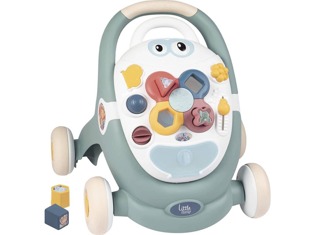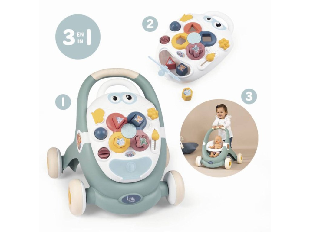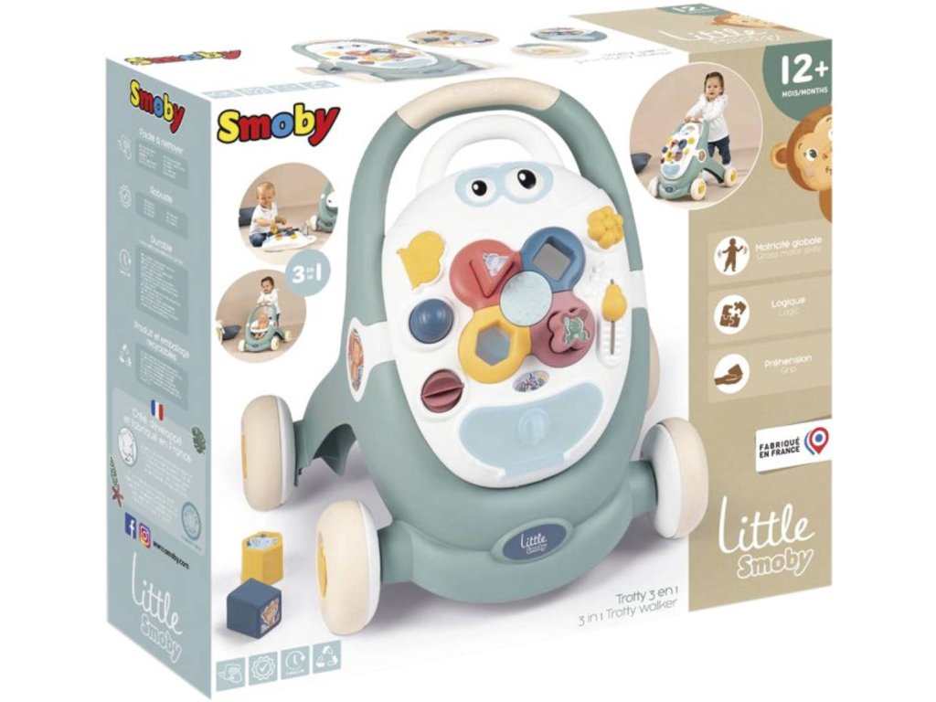 S chodítkem Little Smoby 3 v 1 lze bezpečně objevovat svět, a to jak motoricky, tak všemi smysly. Ergonomická rukojeť zajišťuje robustnímu chodítku bezpečnost při prvních krůčcích. Když se nepoužívá, lze aktivovat systém zamykání kol. V přední části je integrována hrací deska s různými učebními hrami, která podporuje motorické dovednosti. Ti nejmenší poznávají tvary a barvy a jak je správně přiřazovat. Na herní desce jsou také dvě rolovací očíčka, kterými může dítě otáčet, malá dvířka s klíčem na otevírání a zavírání, zrcadlová dvířka, otočná květina, malé otočné kolečko, posuvný brouček se zvukem "crick-crack" a klakson. Hrací desku lze používat i samostatně, lze ji sejmout a snadno přenášet díky rukojeti na horní straně. A jakmile se deska sundá, slouží chodítko i jako kočárek pro panenky, protože pod hrací deskou je sedátko, do kterého lze umístit oblíbenou panenku.