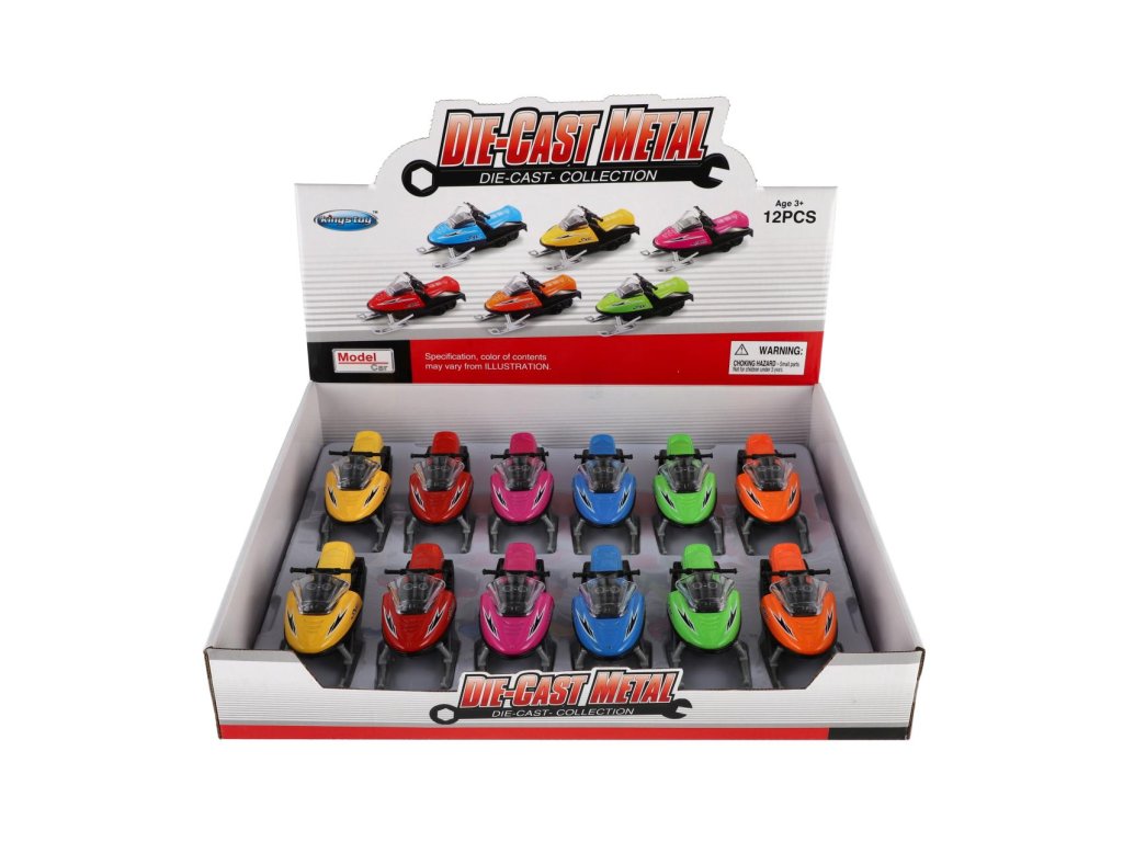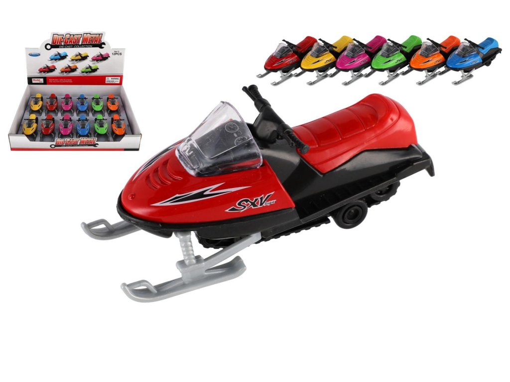 Sněžný skútr kov/plast 13cm na zpětné natažení 6 barev 12ks v boxu