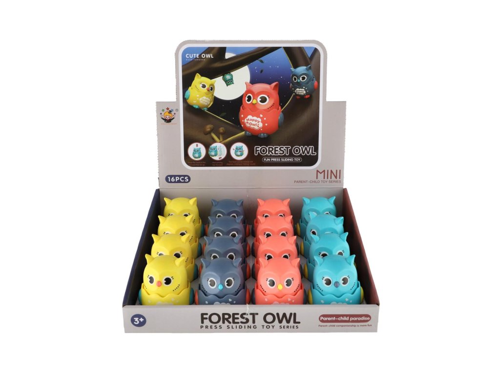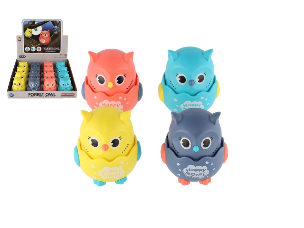 Sova plast 7x8cm mačkací jezdící 4 barvy 16ks v boxu