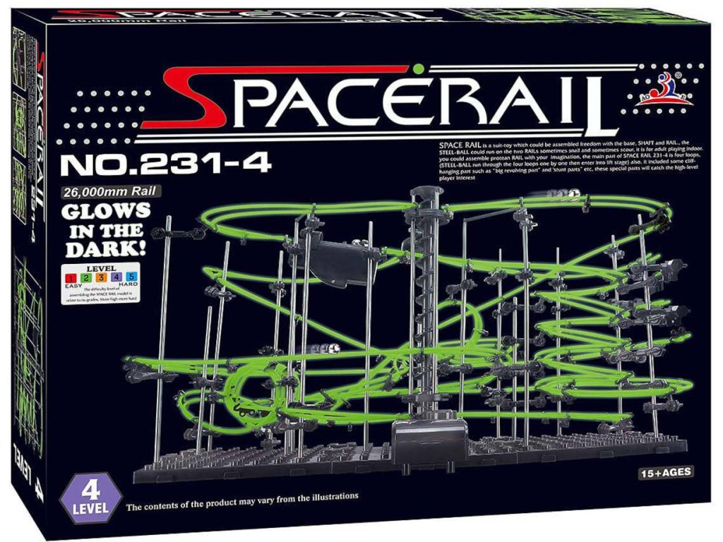 SpaceRail je stavebnice, která chytne a nepustí. SpaceRail je zcela jedinečná a konstrukčně dokonalá stavebnice skrývající neuvěřitelné možnosti zábavy. Stanete se konstruktérem, který bude mít za úkol postavit propracovaný systém drah, kde k dispozici budete mít několik metrů drah, ve kterých budou svištět kuličky. Při stavění využijete poznatky z mechaniky, fyziky, konstrukcí, budete rozvíjet jemnou motoriku rukou. Úžasná zábava pro celou rodinu, která neomrzí, Spacerail vás zabaví na celé týdny, měsíce. Skvělá podívaná, která se jen tak nevidí, současně může být na drahách 4 i více kuliček. Dráha ve tmě svítí efektivní zlenenou barvou!