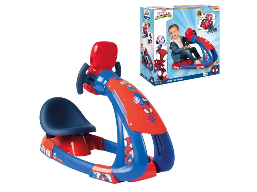 Trenažér pro malé řidiče s motivem Spideyho a jeho kamarád- Pohodlná a nastavitelná sedačka - 3 polohy, mechanické pedály, elektronický volant s rolovací mapou, podsvícení displeje, 15 zvuků aut a Spideyho webu, funkce boost, zpátečka. Rozměry: 85 x 50 x 36 cm. Hmotnost 2,55 kg. Max. nosnost 50 kg.