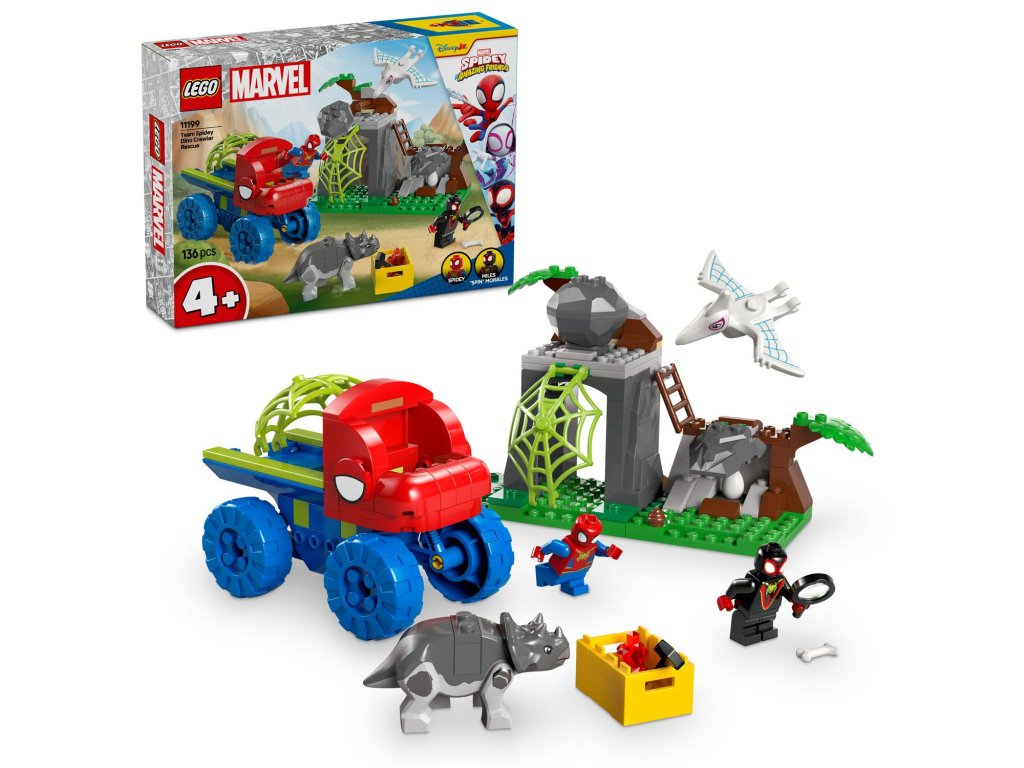 Potěšte fanoušky seriálu Spidey a jeho úžasní přáteléstavebnicí Spideyho tým a záchrana dinosaurů s truckem (11199) s dinosaury navrženou pro děti od 4 let. Sestavitelný truck obsahuje superhrdiny, dinosaury a zábavné doplňky. Kluci a holky se pustí do kreativního hraní, které jim dodá sebevědomí a prohloubí schopnost řešit problémy. Tato stavebnice LEGO® obsahuje minifigurky Spideyho a Milese „Spin“ Moralese a 2 sestavitelné figurky dinosaurů: Ghost-Spider jako pterodaktyla a Rhina jako triceratopse. Součástí je také Spideyho truck LEGO s velkou pavučinou připevněnou k zadní straně, funkce padajícího kamene ovládaná spouští, dinosauří vejce, které je třeba odhalit, a pavučina, kterou můžete spustit a s její pomocí chytit padoucha do pasti. Nechybí intuitivní pokyny v podobě barevného obrázkového průvodce a samostatné sáčky s kostkami a velkou začátečnickou kostkou, se kterými se děti hned pustí do stavění. Stavebnice LEGO pro děti od 4 let představují skvělý způsob, jak dospělí můžou sdílet zábavu při stavění se svými potomky.
