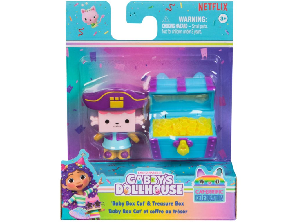 Vstupte do světa Gábinina kouzelného domku s kočičkou Krabičkou a její kočičí truhlou s pokladem! Obsahuje pěticentimetrovou figurku kočičky Krabičky, oblečenou v jejím roztomiloučkém pirátském kostýmu a truhlu s pokladem se zamykacím víkem! Pro další kočičí dobrodružství, hledejte ostatní herní sety - Panda Ťapka a jeho raketová loď, Rybočka a její lázeňské křeslo, Dortě a jeho mixér na dorty, DJ Koucour a jeho violoncello nebo Víla kočička s jejím tančícím kaktusem! (prodávají se zvlášť).