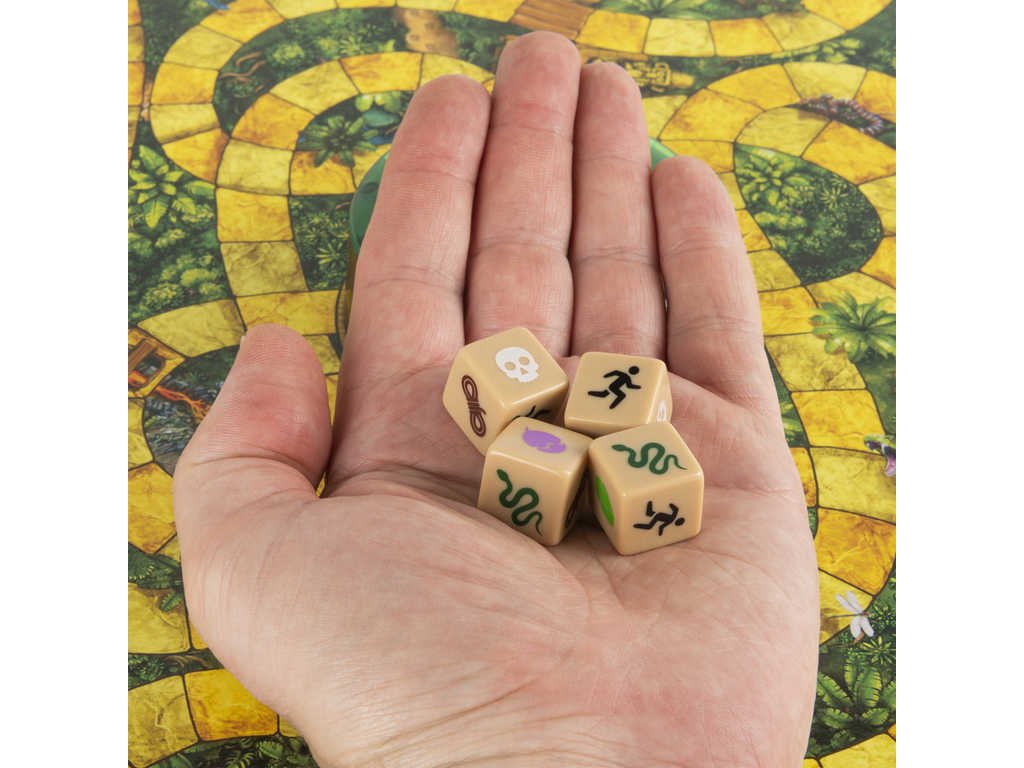 Balení obsahuje: hrací desku, 4 barevné figurky, figurku nosorožce, přesýpací hodiny, číselnou hrací kostku, 4 kostky záchrany, 30 karet nebezpečí, dekodér, návod