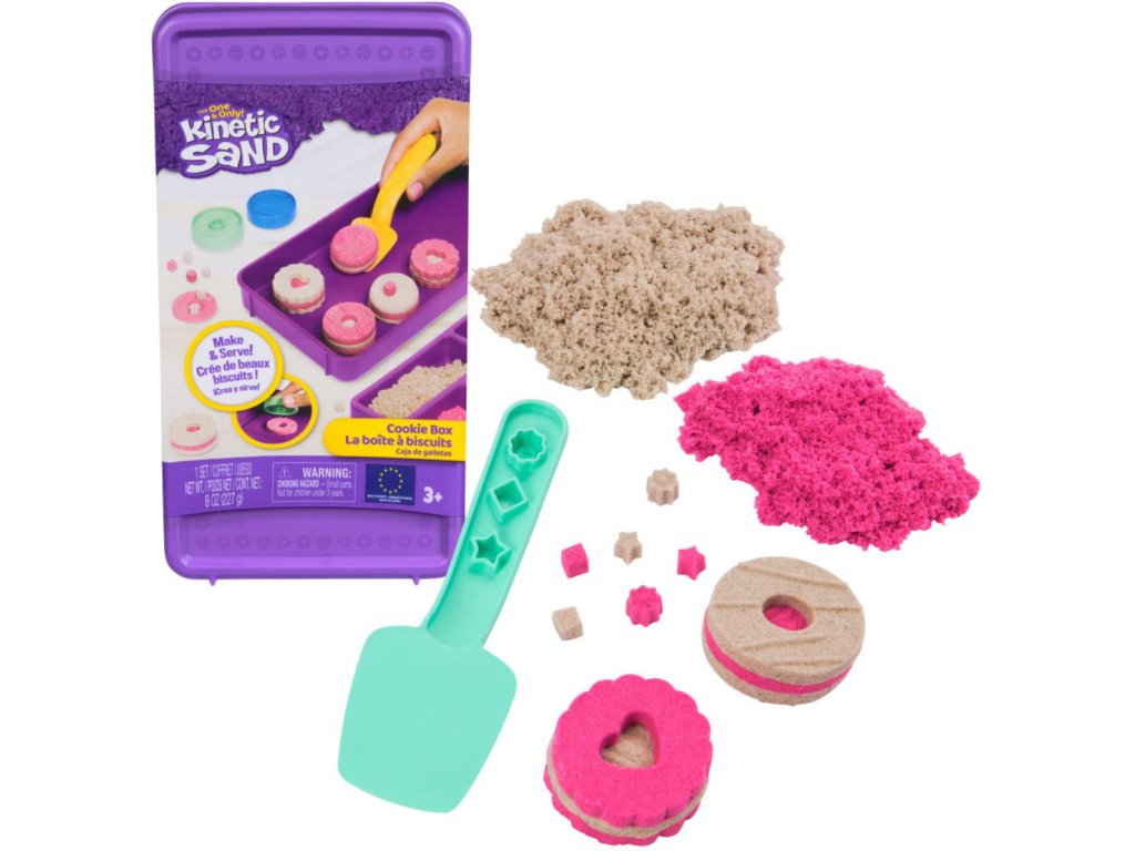 Se sadou kinetického písku můžete tvořit koláčky, kupit na sebe a zdobit! Tato tematická sada kinetického písku podnítí představivost, zatímco děti budou formovat a tvarovat lahodné dobroty. S více než 225 g růžovo-hnědého písku míchejte, spojujte a vrstvěte písek do 2 oboustranných forem. Udělejte plněné sušenky, čokopecičky a mnohem více! Ozdobte mini formičkami na rukojeti špachtle a podávejte své dobroty z víka krabičky, pak je rozmáčkněte a znovu vytvořte! Krabička na sušenky obsahuje také sběratelský arch pro inspiraci. Vytvořte si sušenky svých snů se sadou kinetického písku na tvoření koláčků!