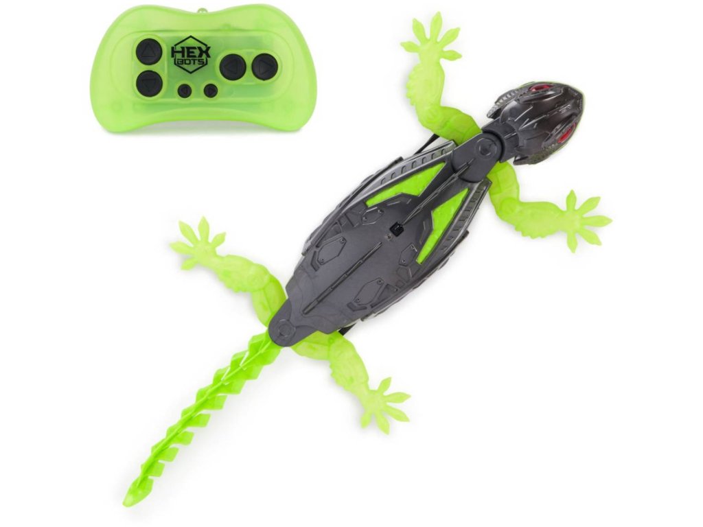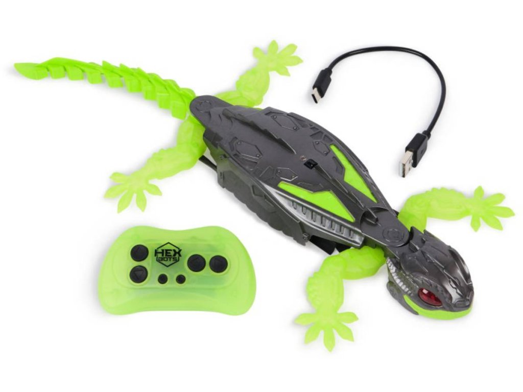 Hex Bots RC gekon, zvířátko na dálkové ovládání. Umí lozit po stěnách. Tělo z plastu a silikonu. Součástí dobíjecí kabel USB. Hračka na baterie, s LED světlem.