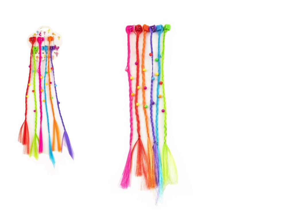 Snad každá holčička si přeje mít barevné dlouhé vlasy. Dopřejte jí to díky barevnému příčesku, který je připevněn na sponce/skřipci do vlasů. Jednotlivé příčesky jsou dlouhé cca 30 cm. Barevné copánky mohou být také vhodným doplňkem ke karnevalovému kostýmu. Balení obsahuje 6 ks copánků s ozdobou v podobě kytiček.