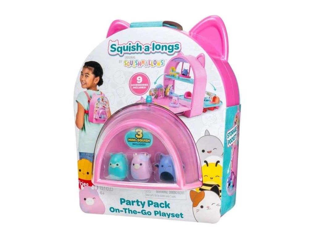 Představujeme Squish-a-longs, vaše oblíbené Squishmallows ve zcela nové velikosti 2,5 cm! Mini-Squish jsou velmi sběratelské, přeměňují se na zázraky, které můžete nosit a jsou ideální na cesty. Hrací sada Party Pack On-the-Go je batoh s nastavitelnými popruhy a přední úložnou kapsou, který se promění v úžasné místo na párty