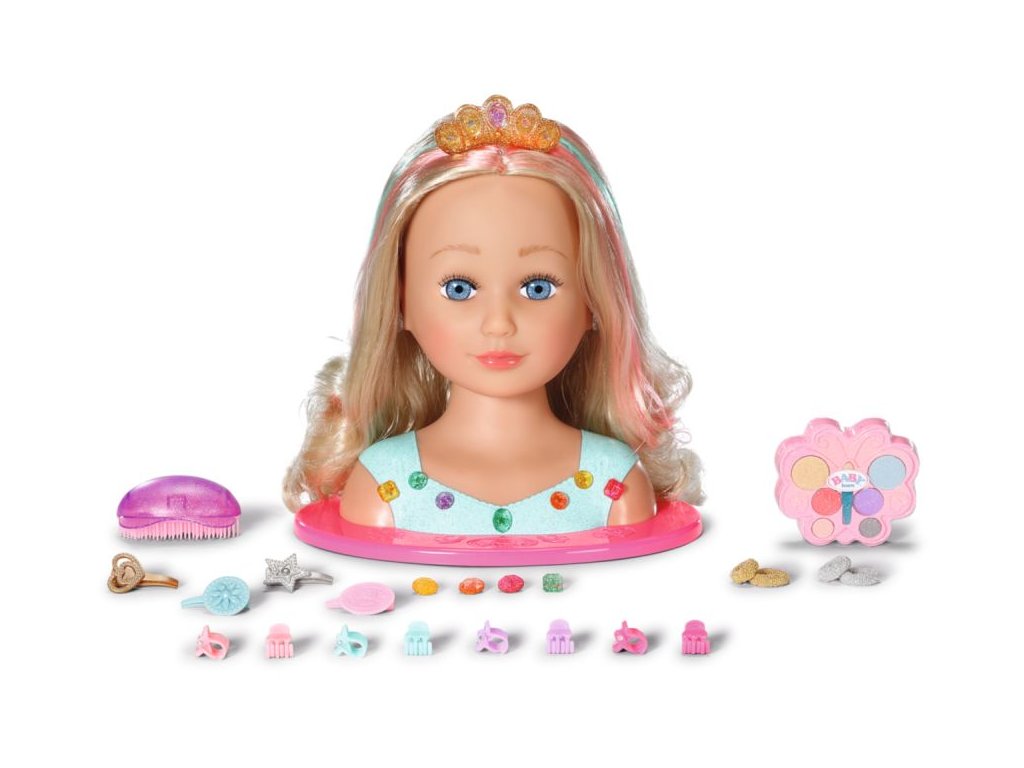 Starší sestřička BABY born Česací hlava s paletkou s make-upem, kartáčem, 4 sponkami, 8 skřipečky, 4 gumičkami, korunkou a 14 nacvakávacími drahokamy.
