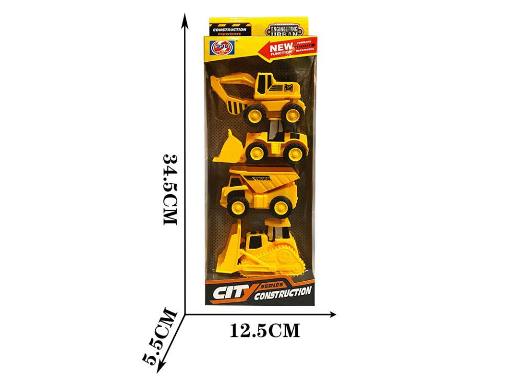 4 malé stavební stroje. Bagr, sklápěčka. Velikost 9 cm.